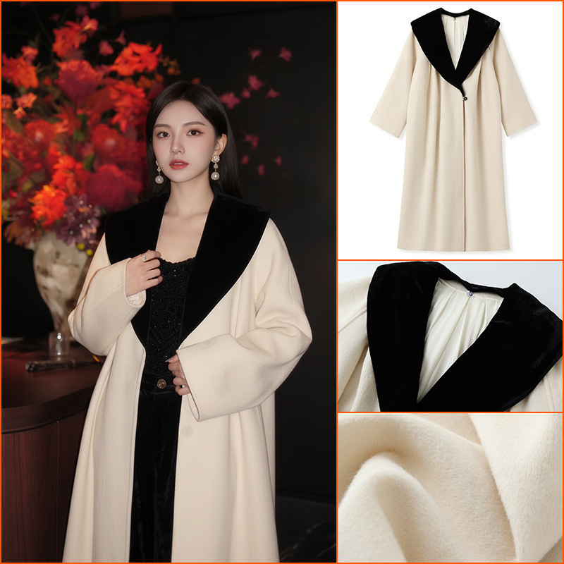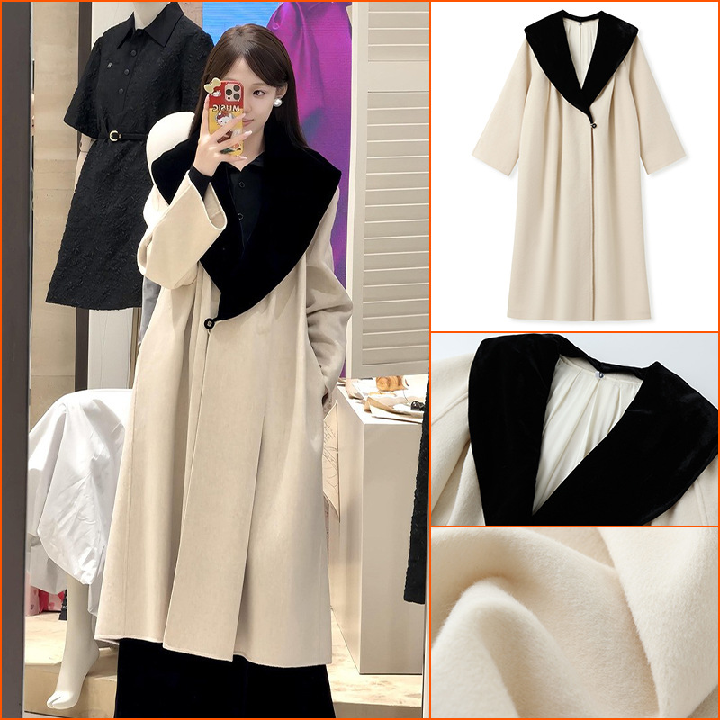 高级感轻奢大翻领慵懒感羊毛大衣女秋冬中长款撞色毛呢外套 NX044