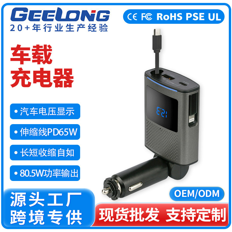 跨境批发独立PD65W汽车车载手机充电器超级快充带伸缩线电压显示