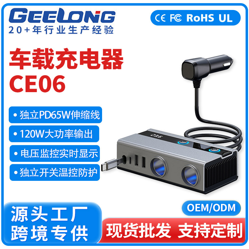 独立开关温控保护120W一拖二汽车点烟器伸缩线车载充电器超级快充