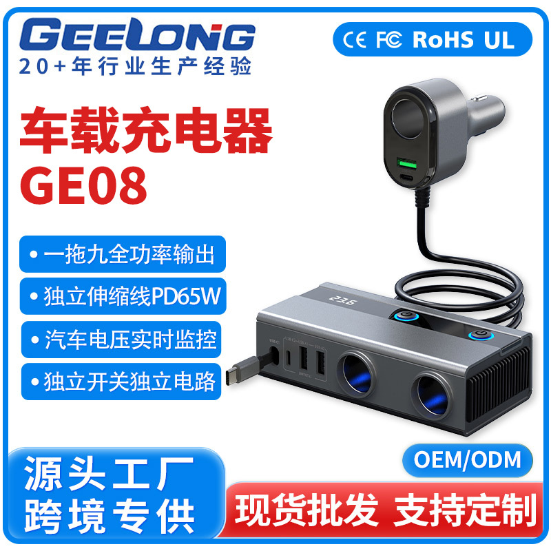 一拖九汽车点烟器独立开关显电压伸缩线PD65W车载充电器超级快充