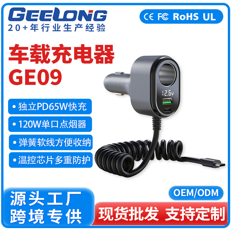 现货通用120W汽车点烟器大功率电压显示弹簧线智能快充车载充电器