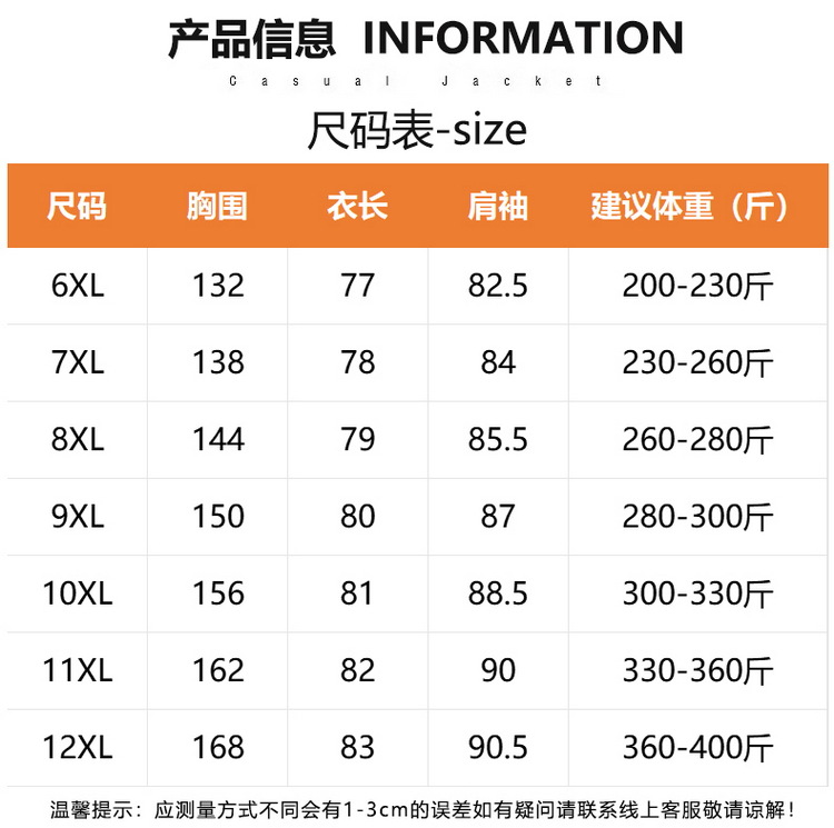 尺码 6XL-建议200-230斤,7XL-建议230-260斤,8XL-建议260-280斤,9XL-建议280-300斤,10XL-建议300-330斤,11XL-建议330-360斤,12XL-建议360-400斤