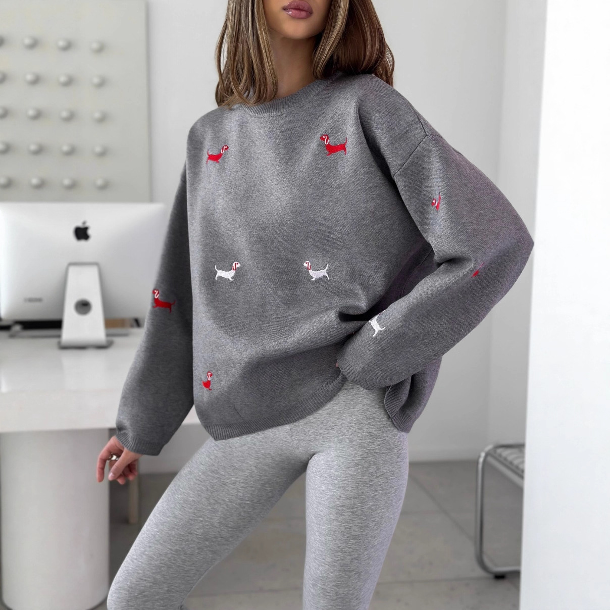 欧美2025腊肠狗刺绣套头毛衣女秋冬百搭款慵懒长袖针织衫上衣批发