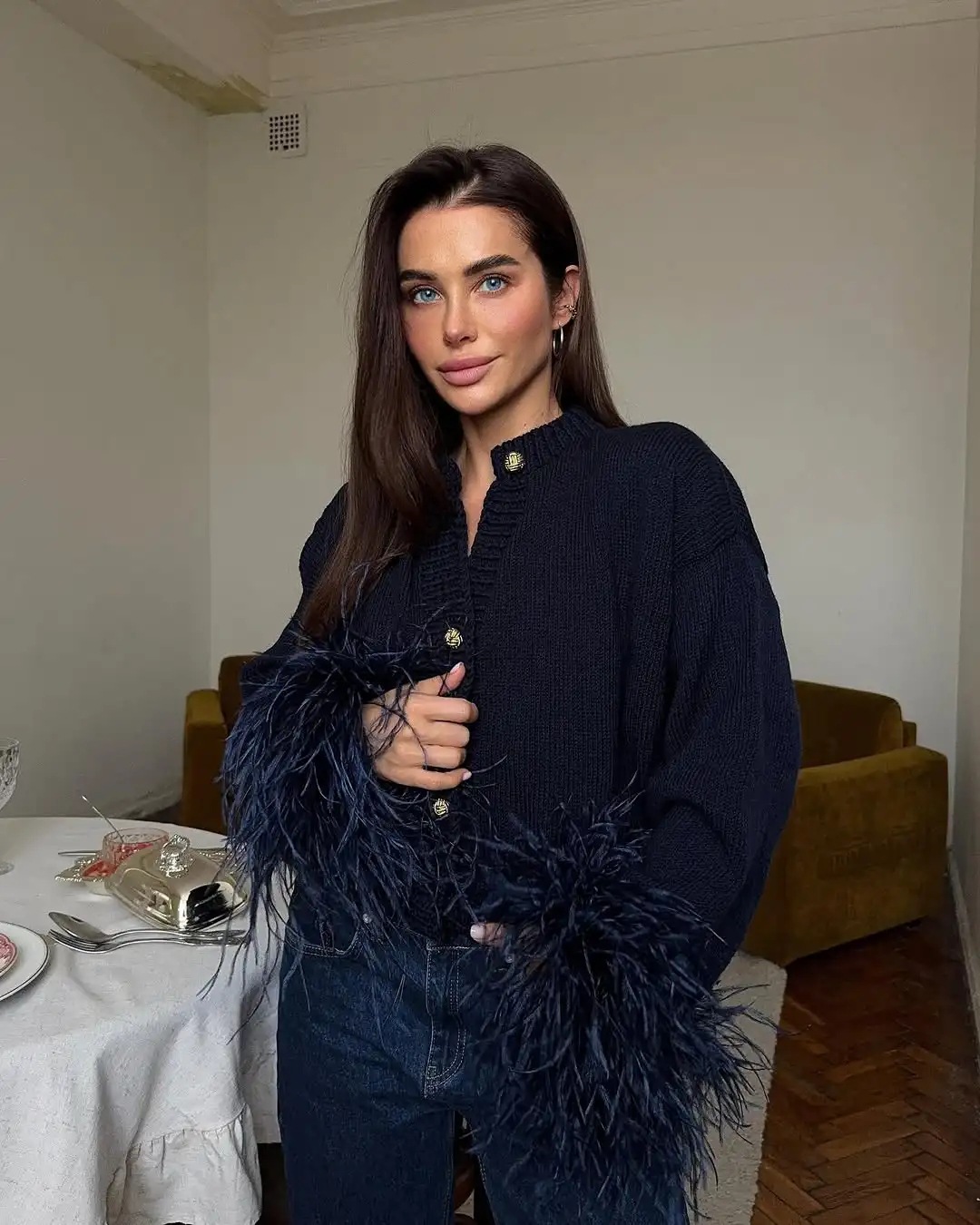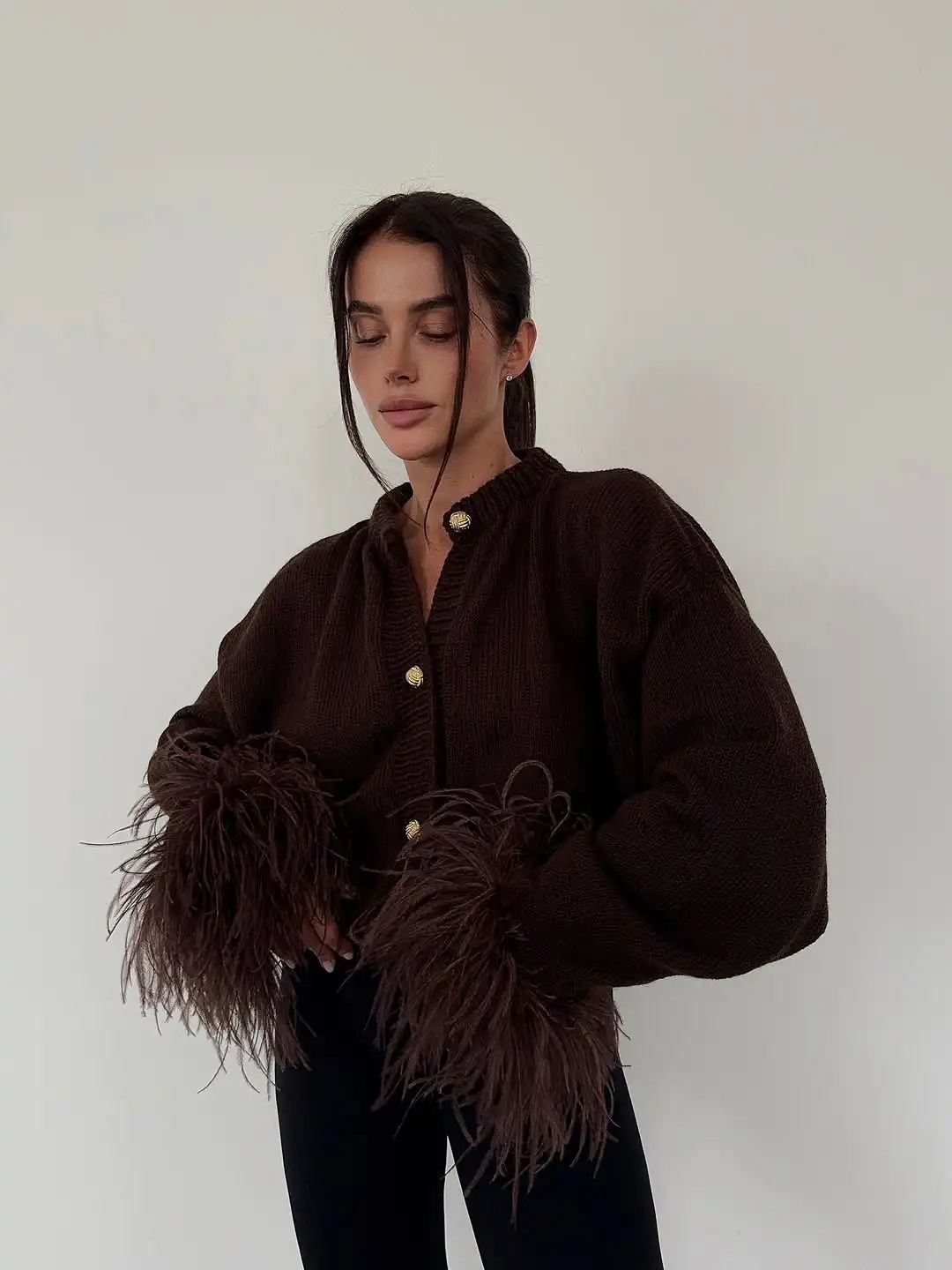 跨境跨境欧美女装速卖通INS爆款袖口毛毛拼接开衫毛衣百搭开衫秋