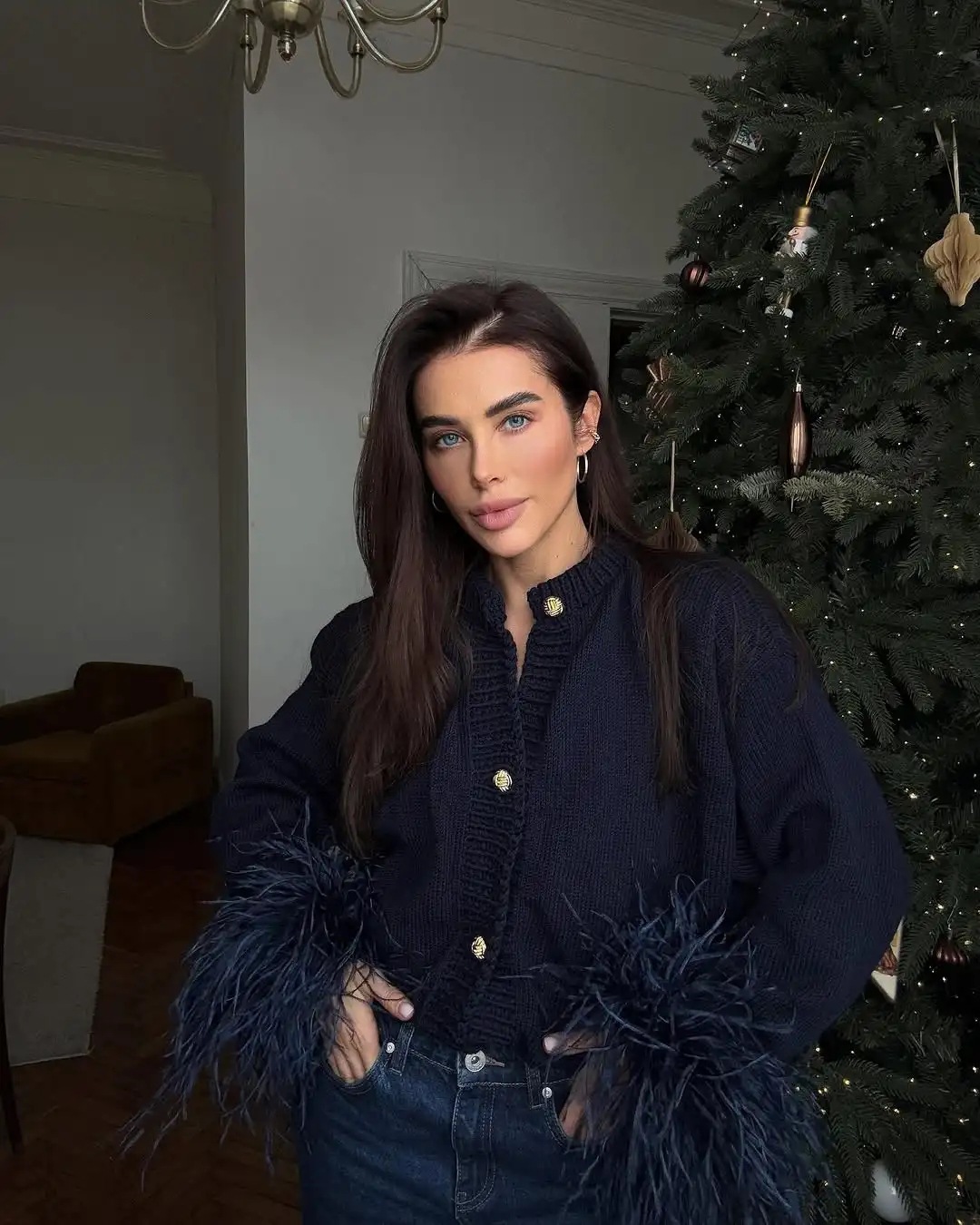ヨーロッパとアメリカの貿易向け秋冬新作、エレガントな雰囲気のレッドフェザーデザインニットカーディガン