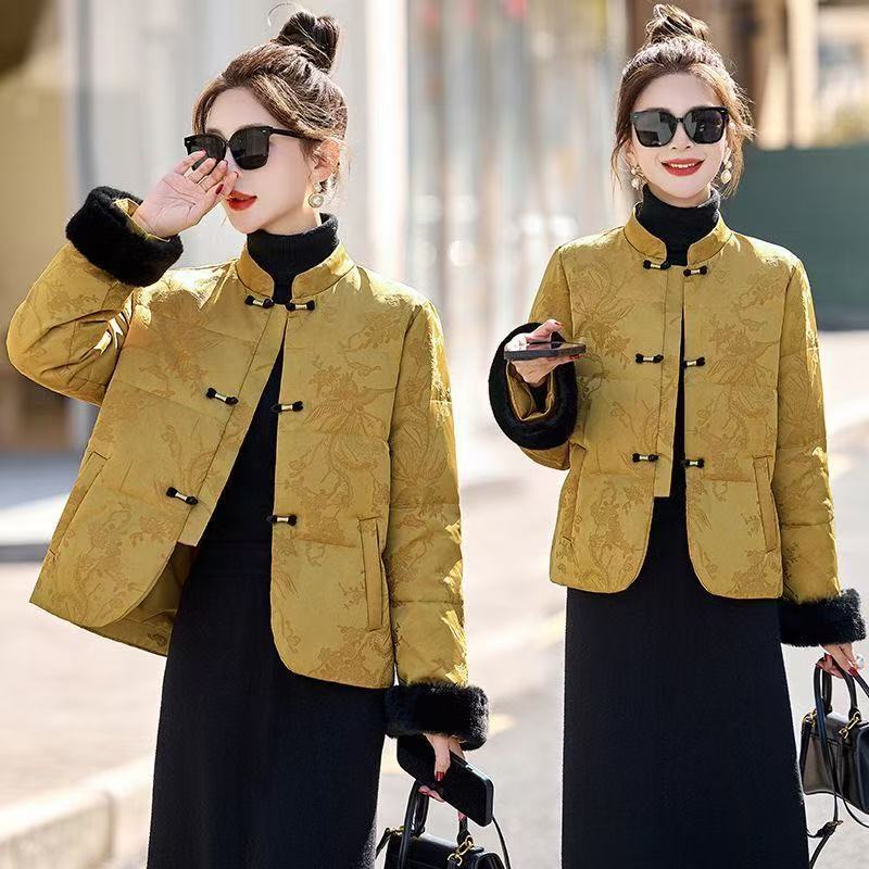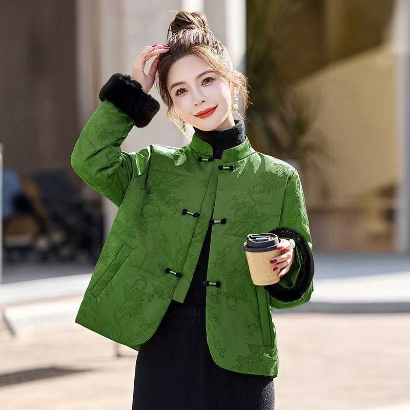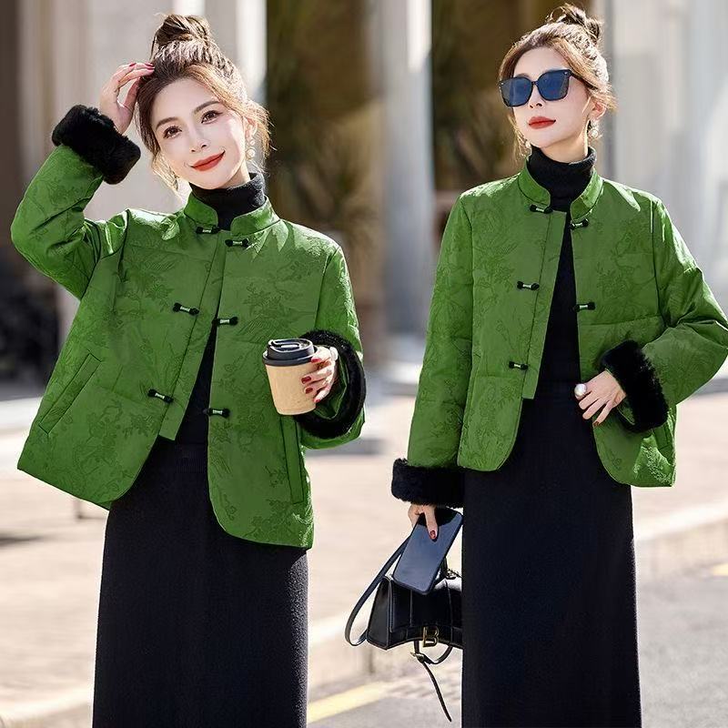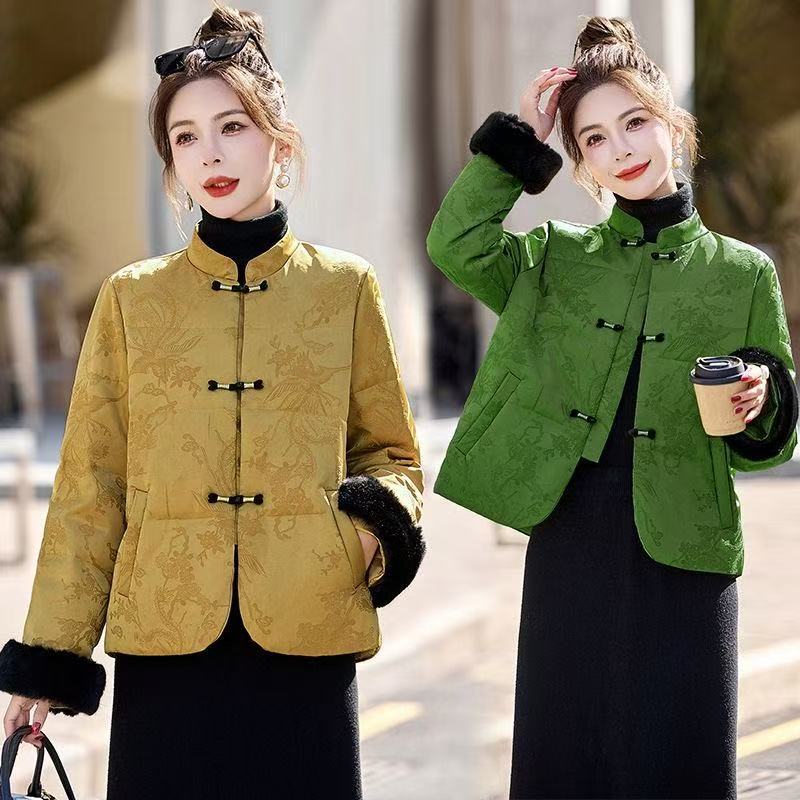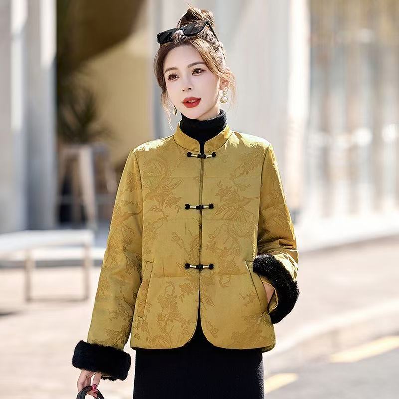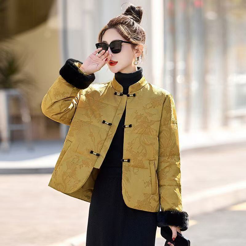 中老年女装国风盘扣提花立领高品质短款羽绒棉服女小款短外套小众