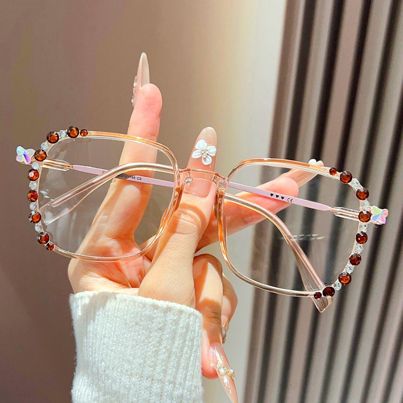 2055新款镶钻防蓝光眼镜男女士日韩时尚冷茶色镜框超轻高清老花镜