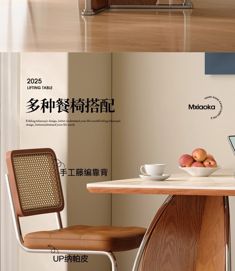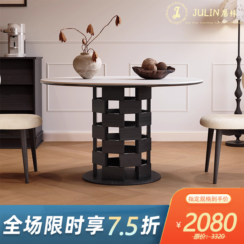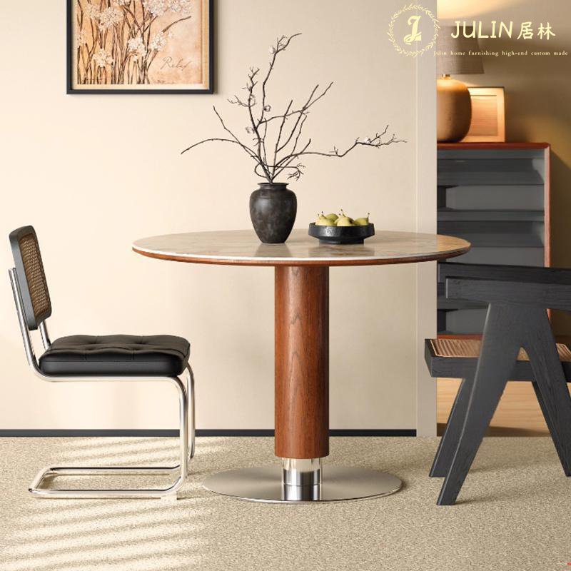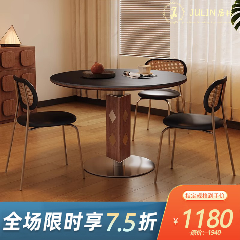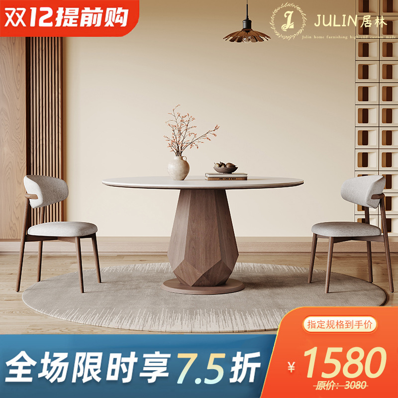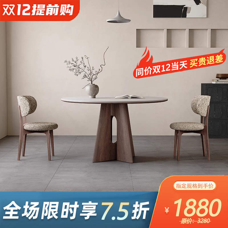 白蜡木实木胡桃色餐桌圆桌家用小户型洽谈中古风洞石岩板餐桌组合