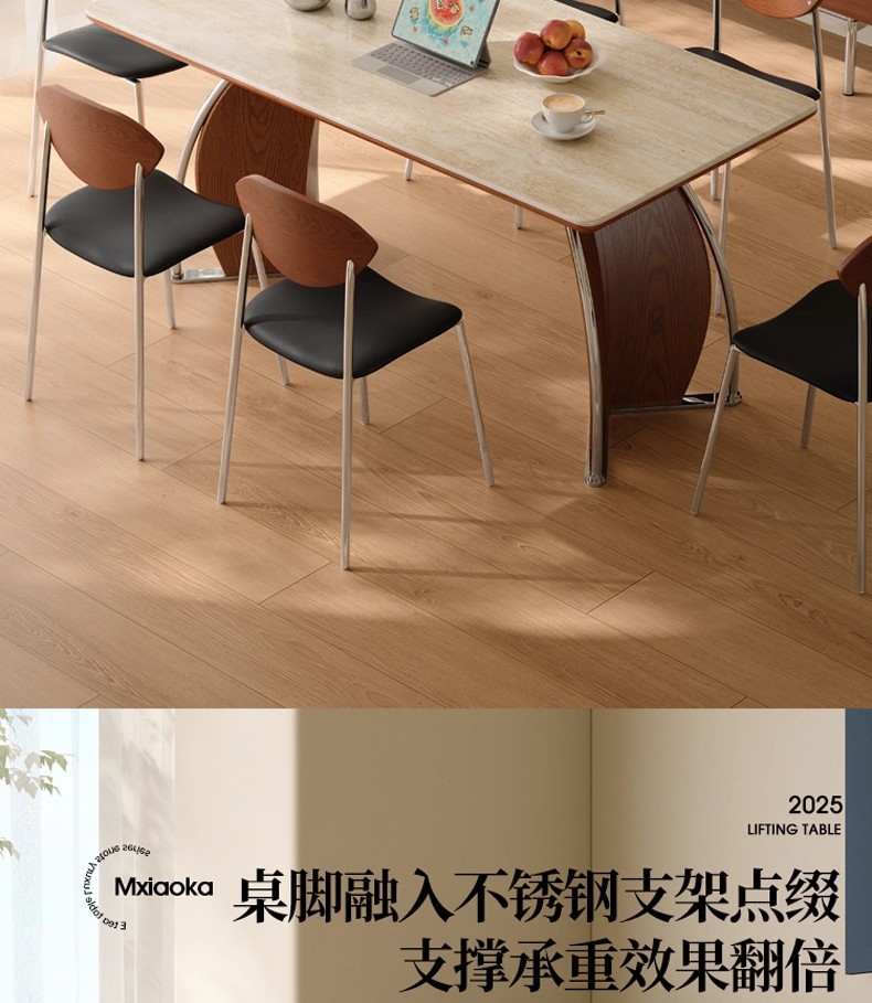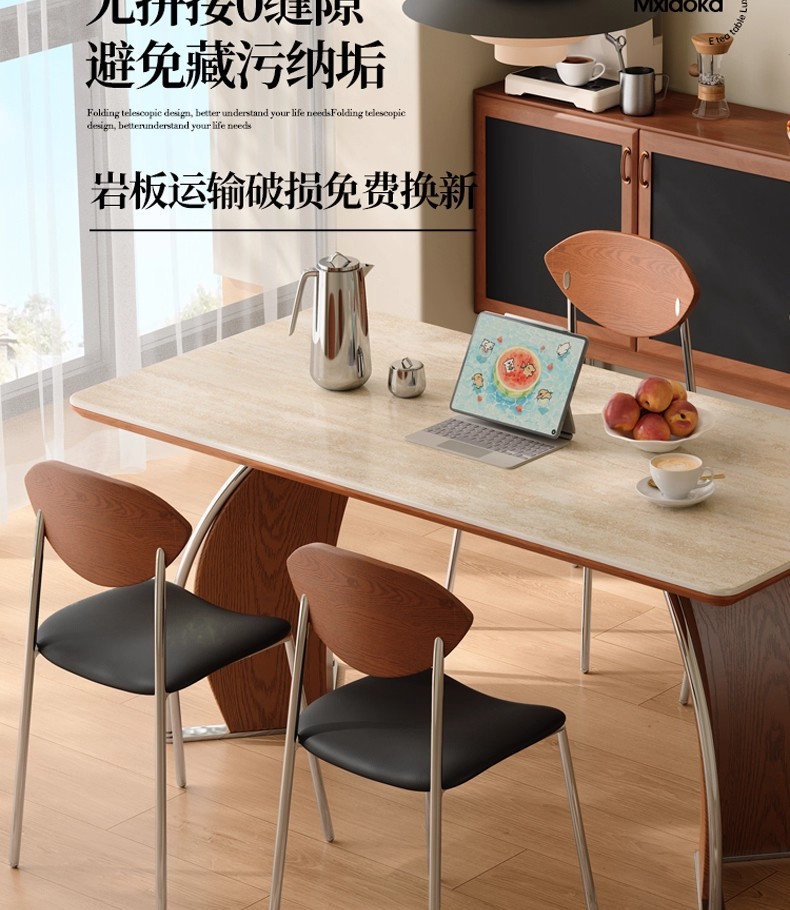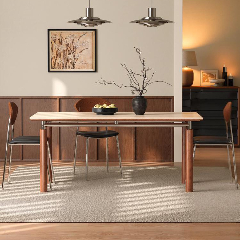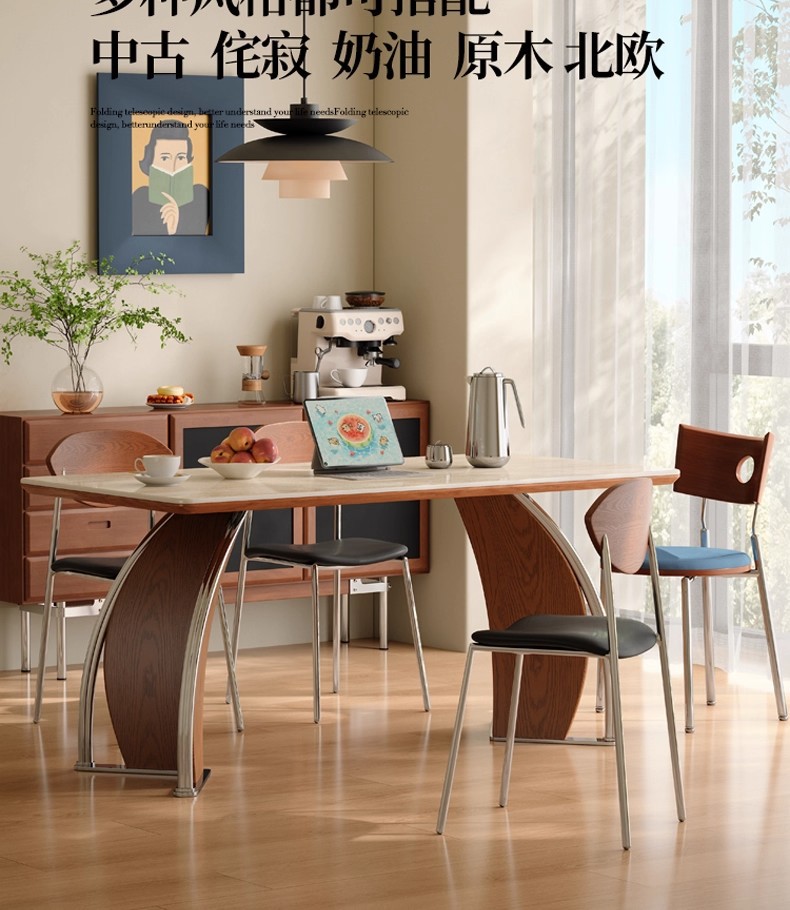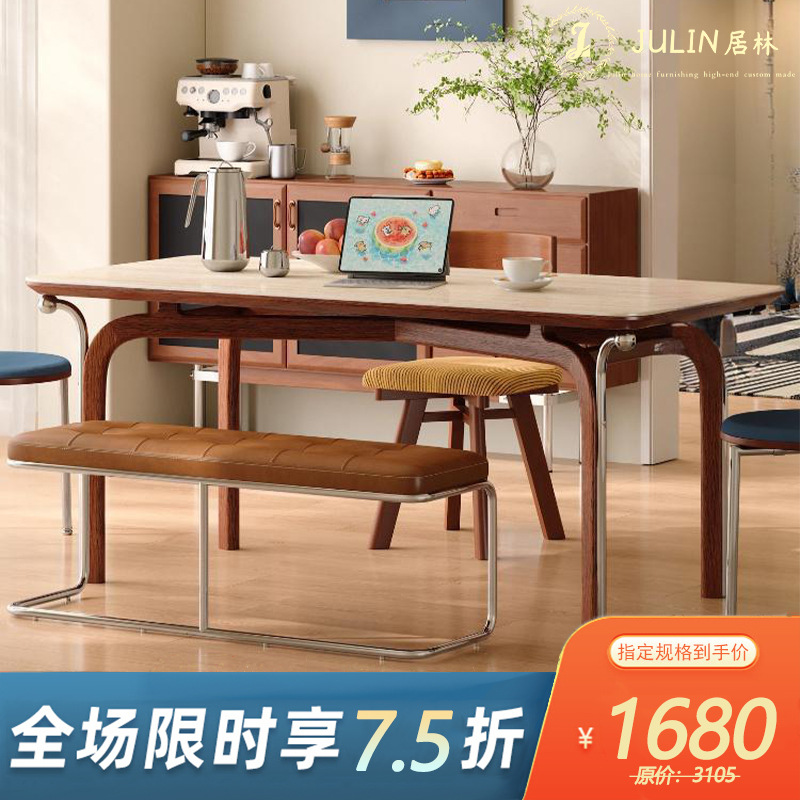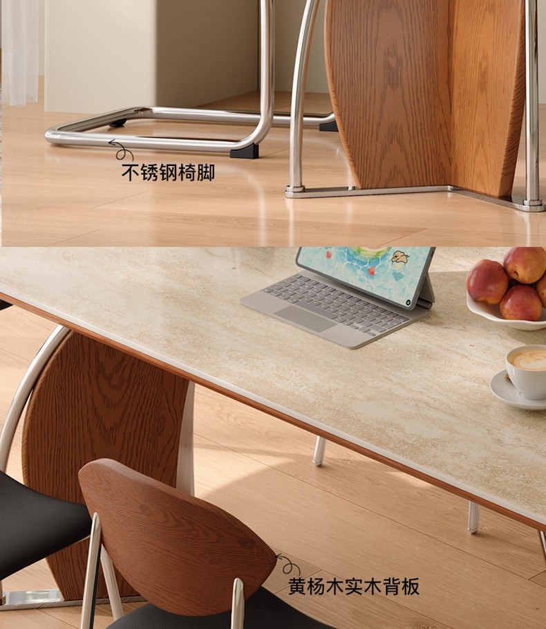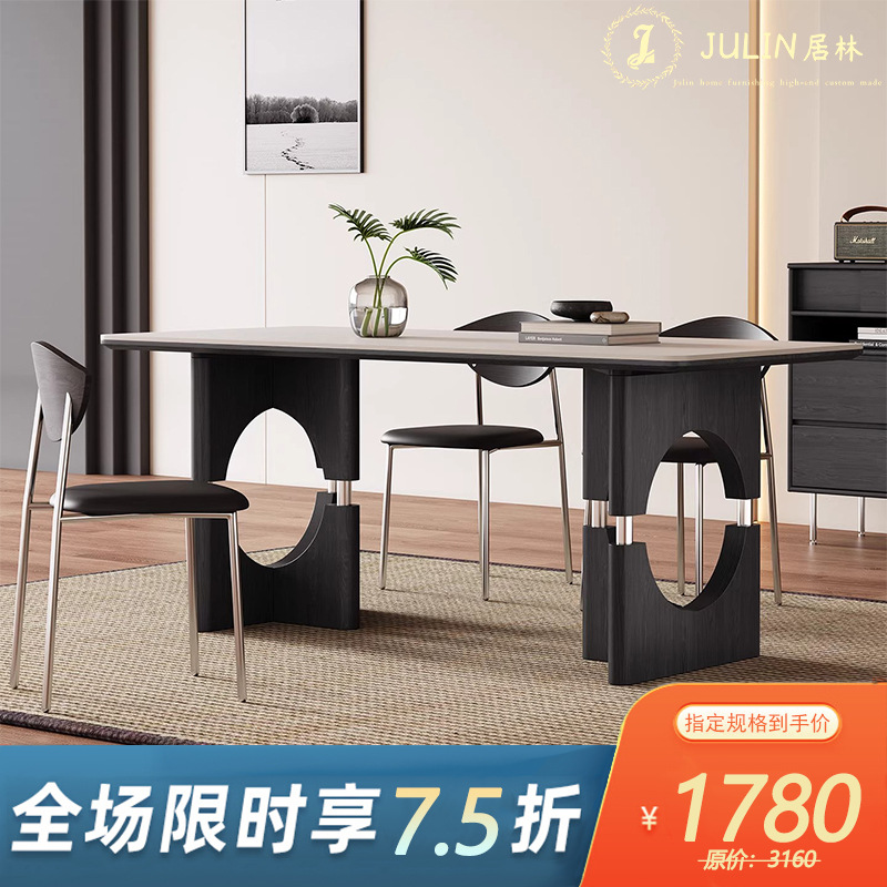 中古风实木岩板餐桌不锈钢复古饭桌家用小户型长方形洞石岩板餐桌
