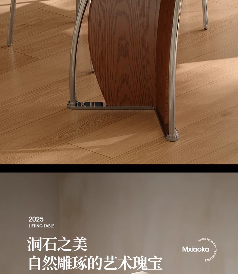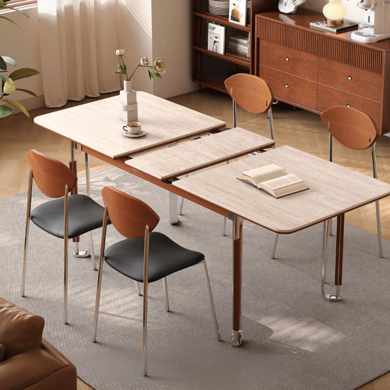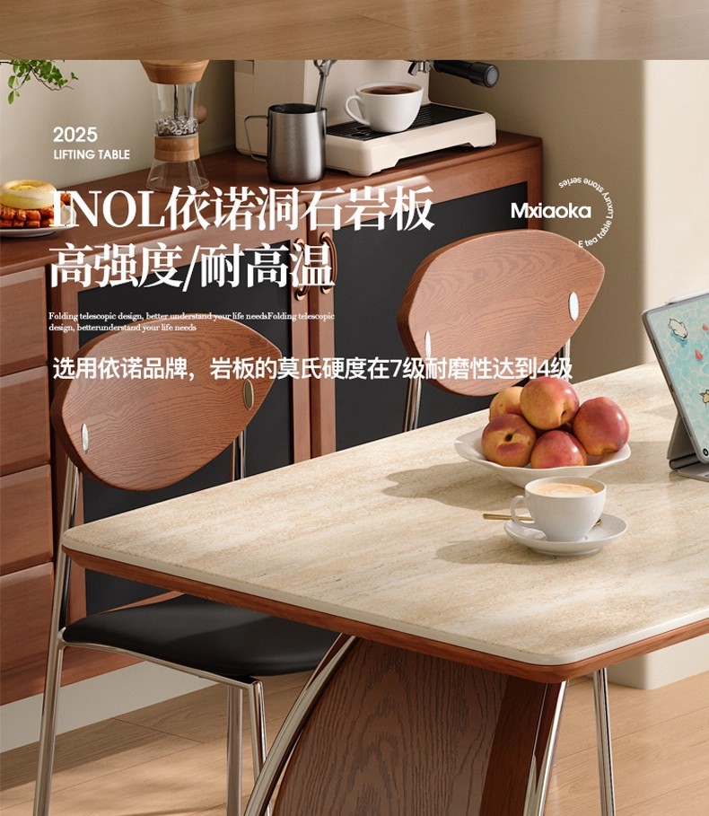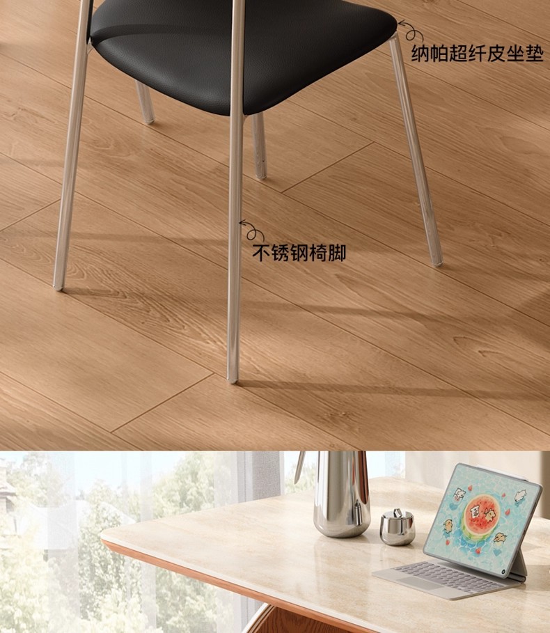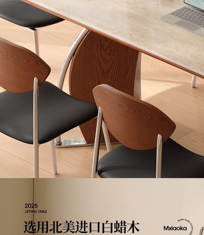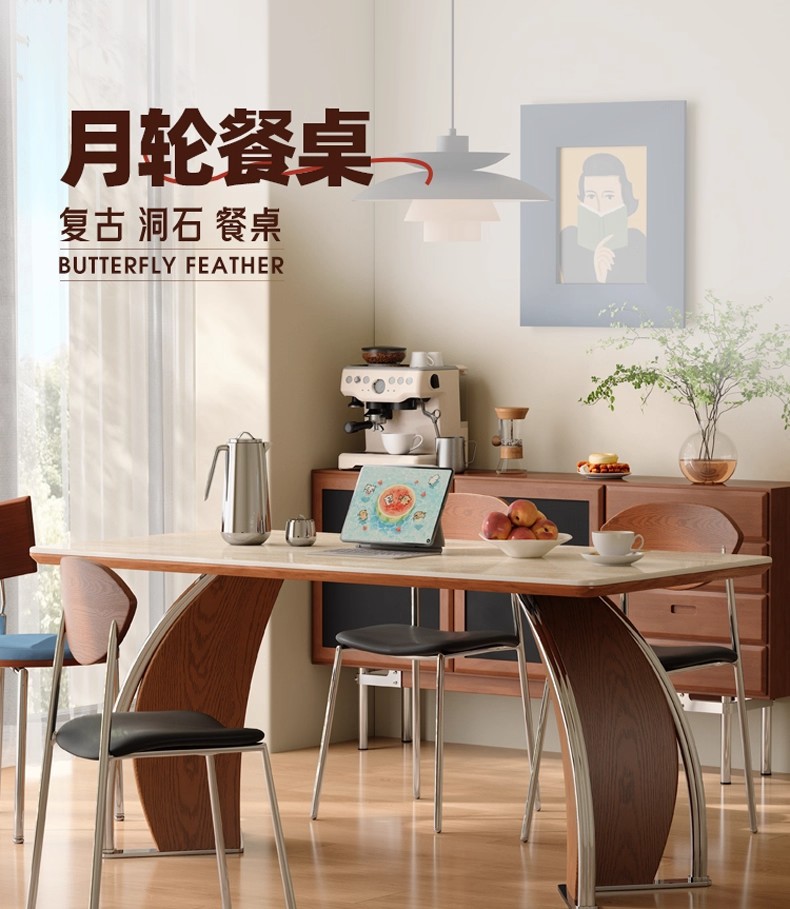 中古风实木岩板餐桌不锈钢复古饭桌家用小户型长方形洞石岩板餐桌