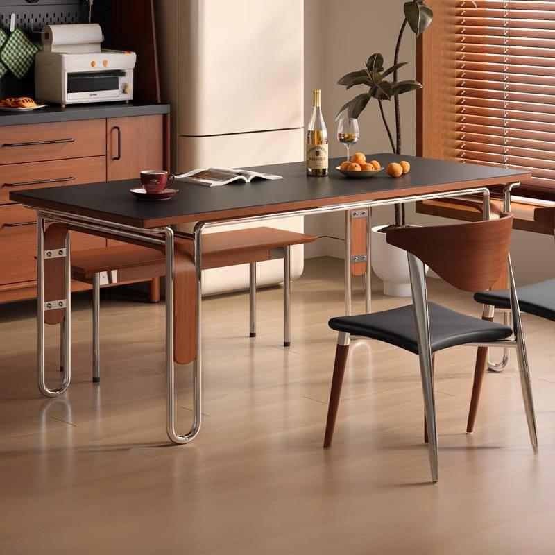 中古风豆芽实木岩板餐桌家用小户型长方形北欧不锈钢餐桌椅组合