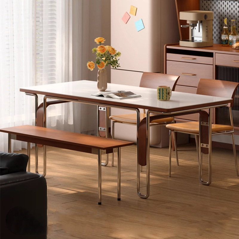 中古風純白色岩板実木食卓長方形北欧ステンレスハウスレトロ家具食事テーブル