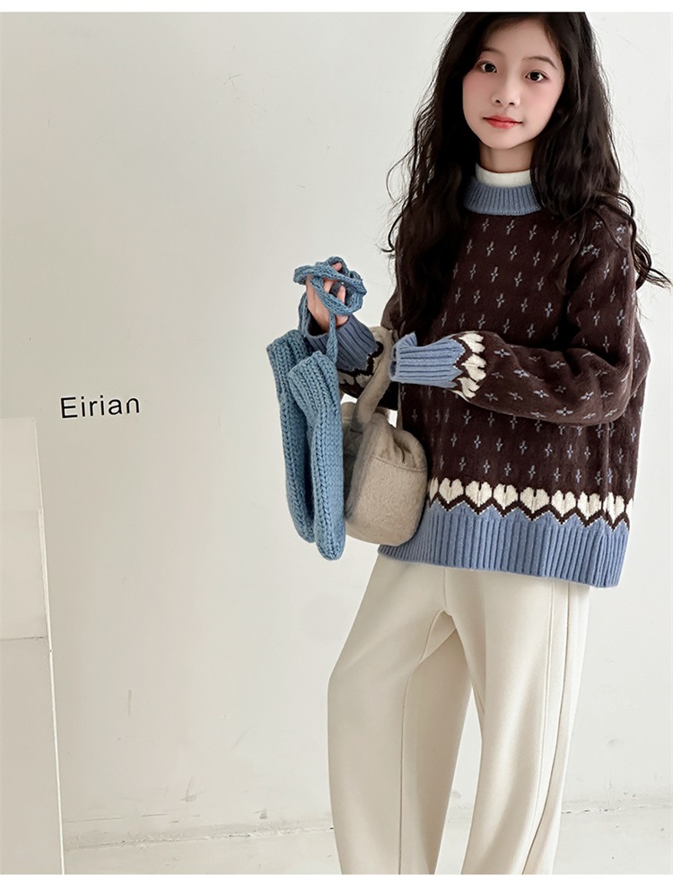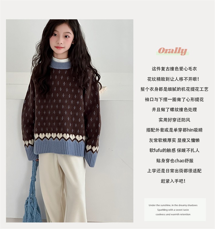 女童毛衣秋冬款2025新款儿童冬装大童洋气撞色加厚套头圆领针织衫