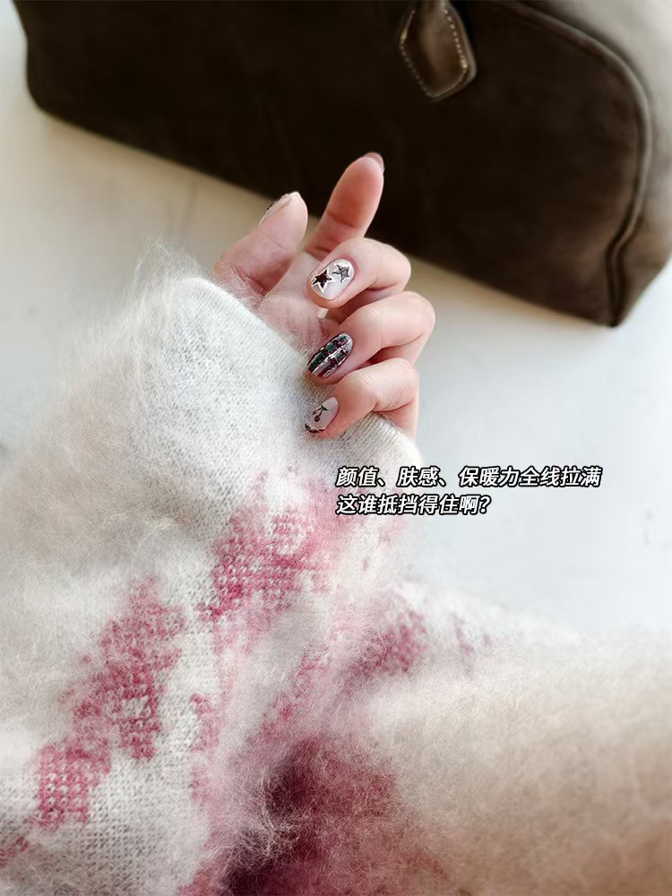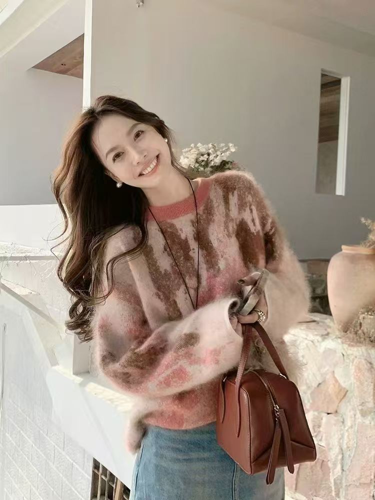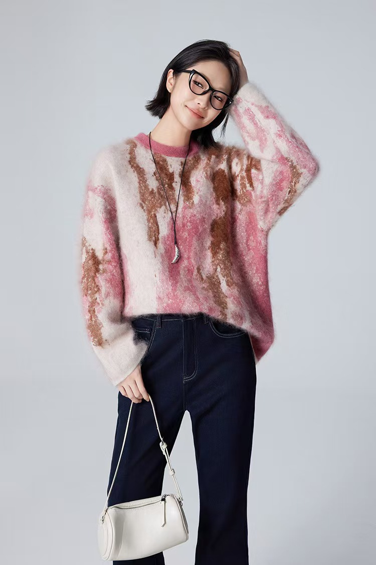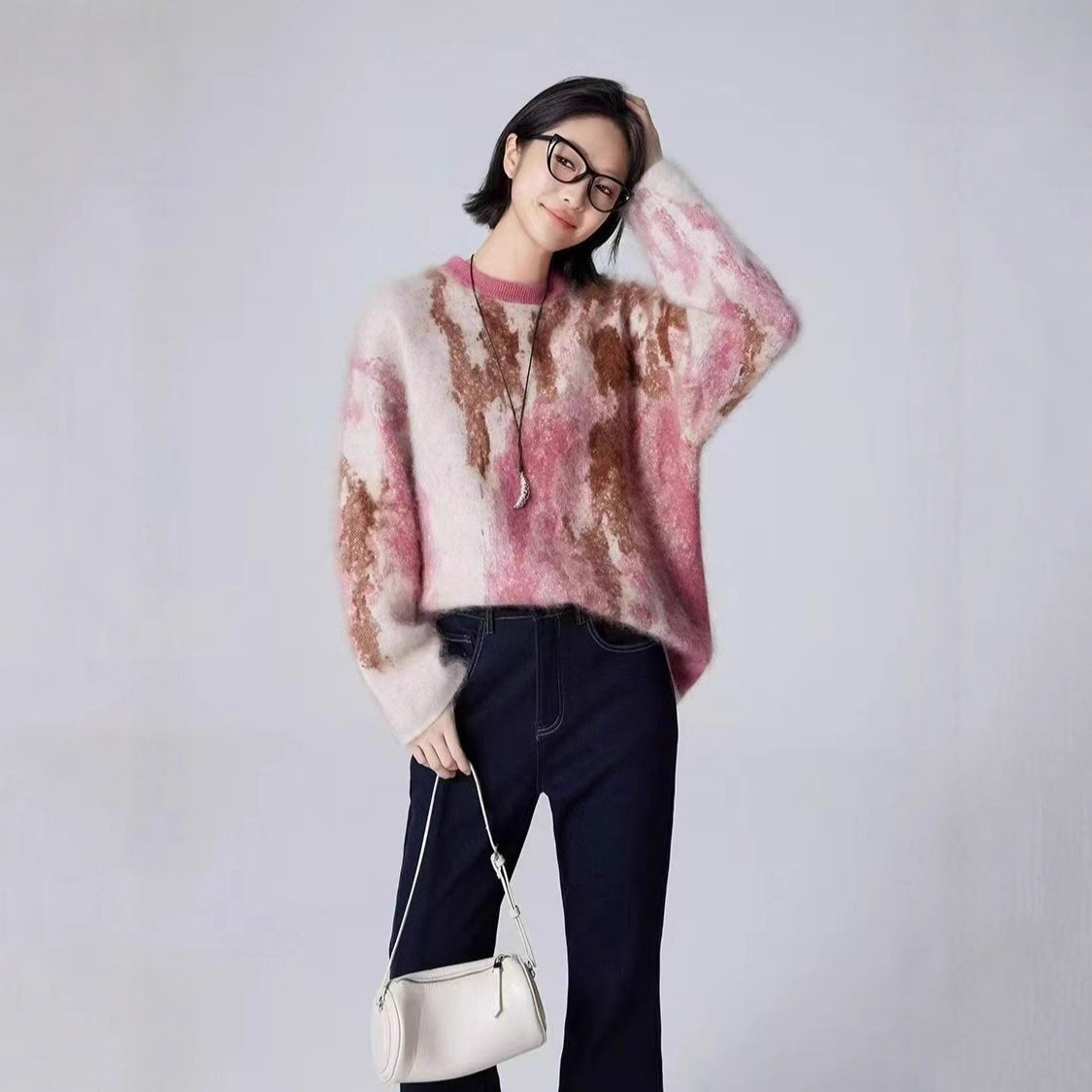 软糯羊毛衫重工提花拉毛圆领毛衣宽松显瘦套头针织衫美洋粉羊毛衫