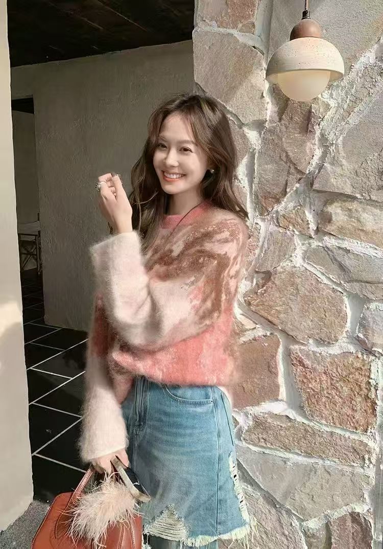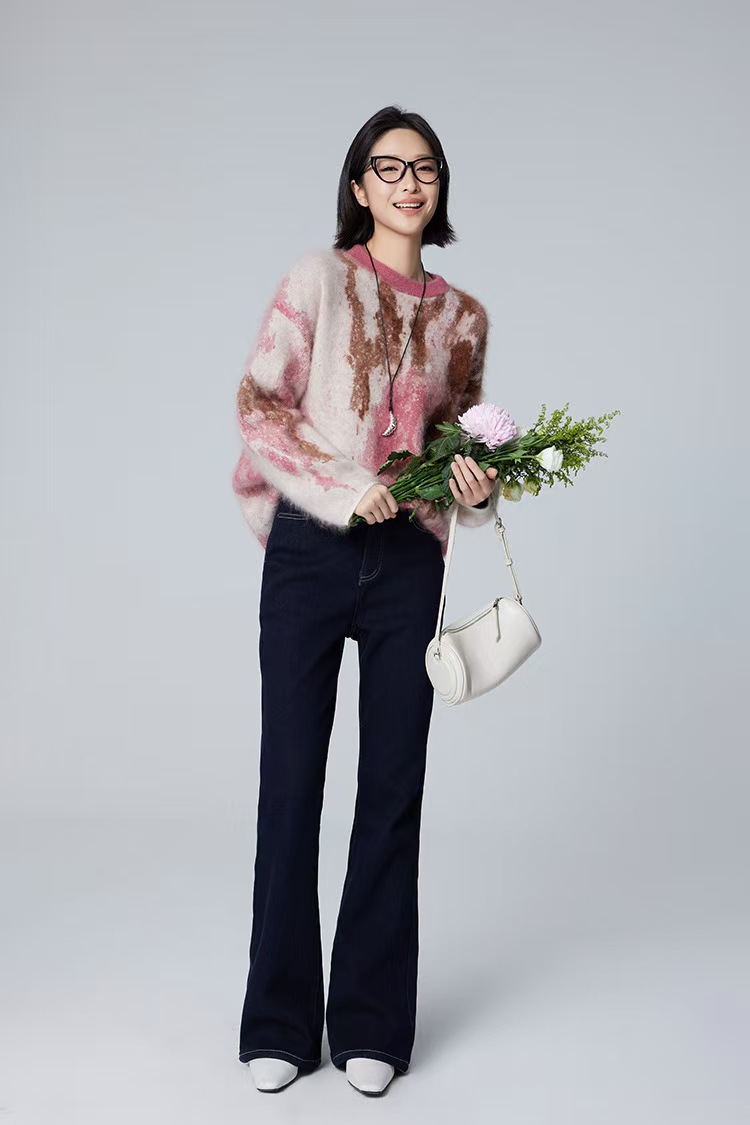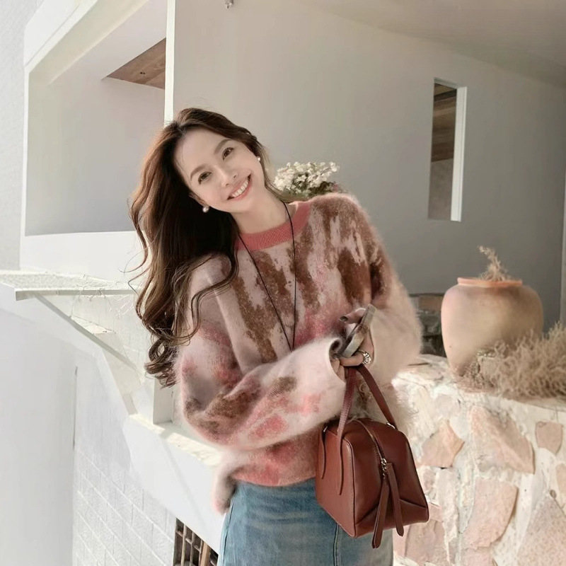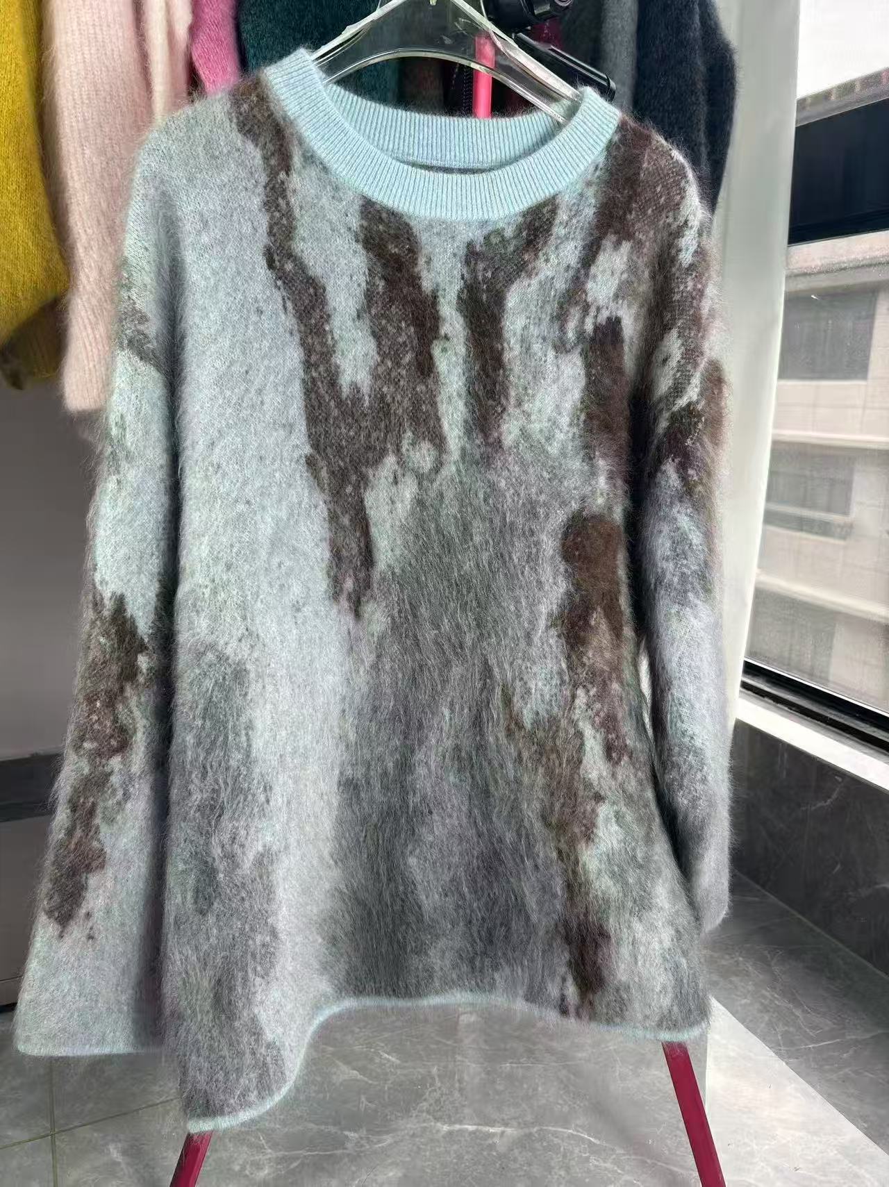 软糯羊毛衫重工提花拉毛圆领毛衣宽松显瘦套头针织衫美洋粉羊毛衫