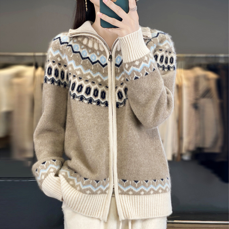 七针加厚纯羊毛衫外套高翻领女式针织开衫秋冬新款提花长袖毛衣衫