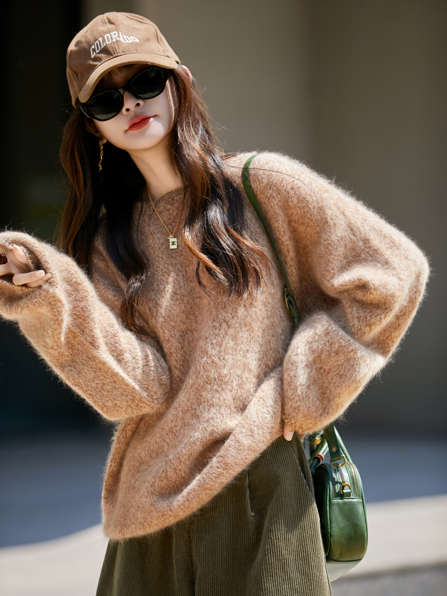 100%纯羊毛2025秋冬新款女式宽松圆领复古加厚套头打底针织衫毛衣