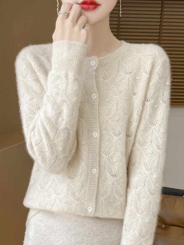 2025新款春秋外套100羊毛开衫女士洋气外搭镂空毛衣圆领短外套