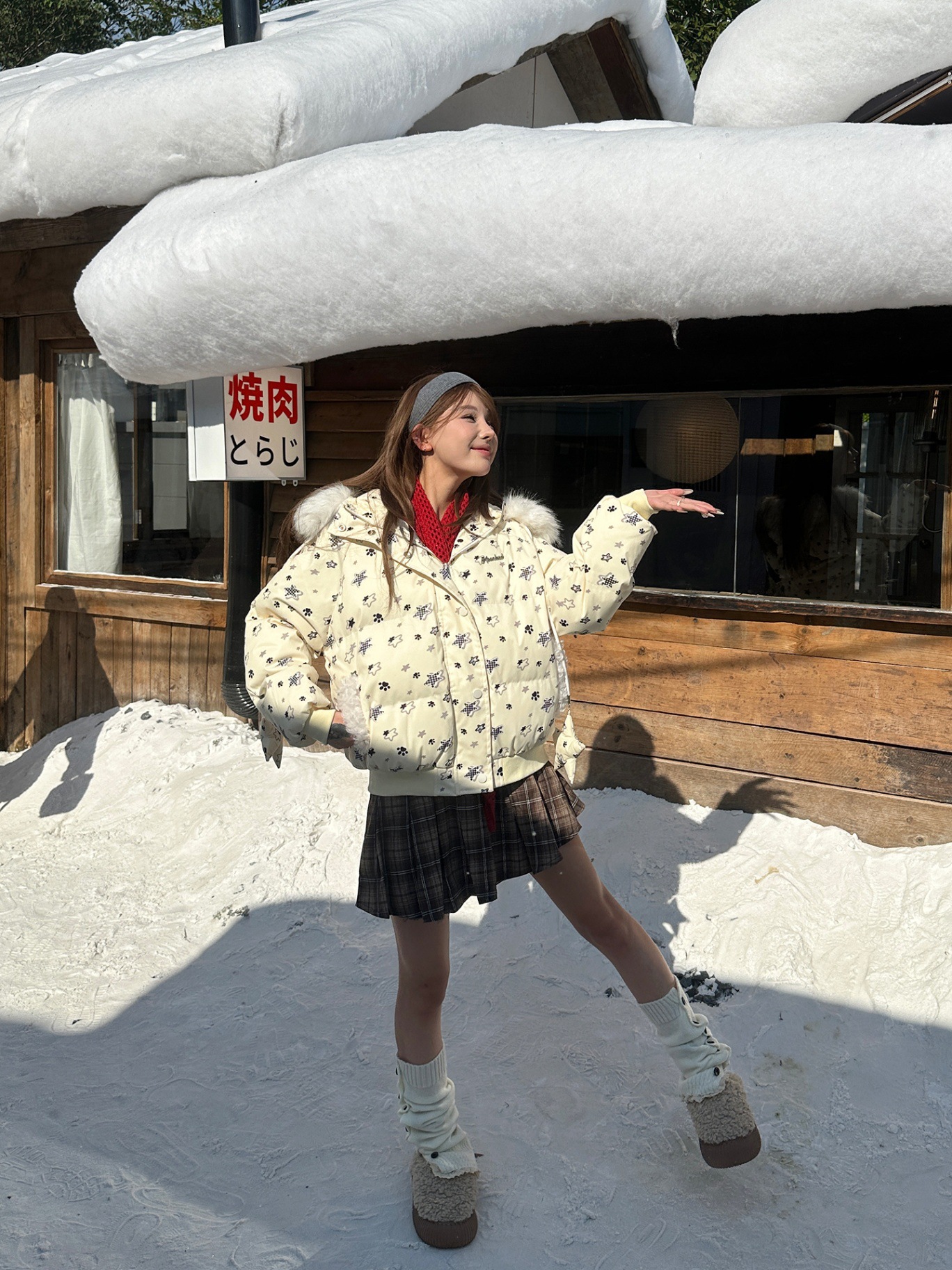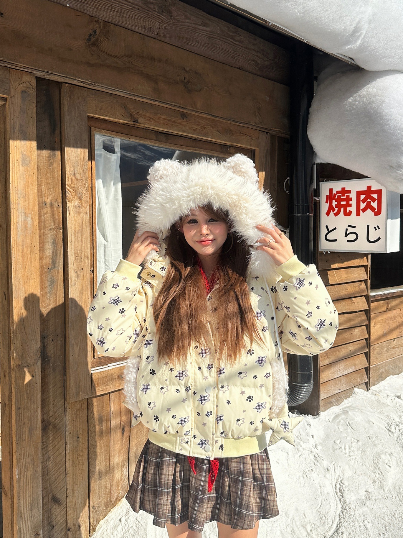甘くて可愛い毛がふわふわしていて、帽子と白の色合わせの綿入れのコートがあります。