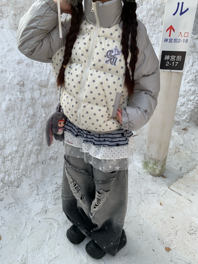 美式复古波点拼接短款棉服外套女冬季宽松保暖面包服棉衣