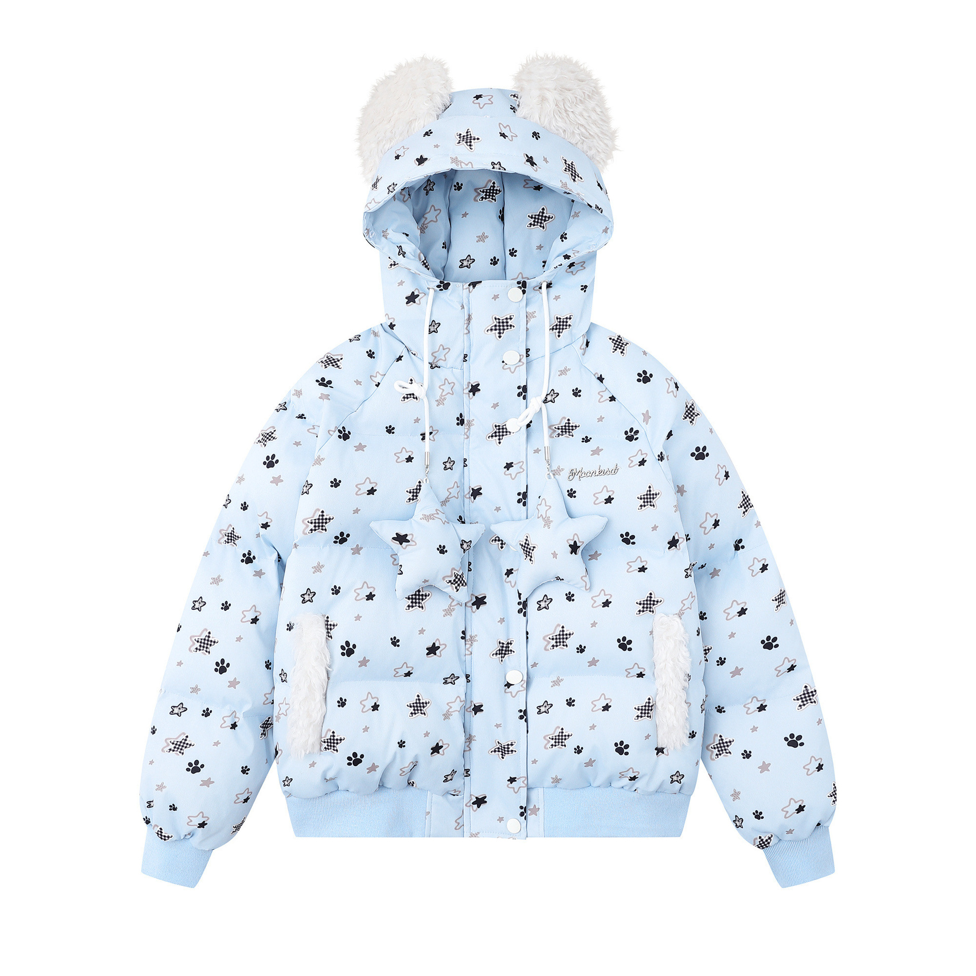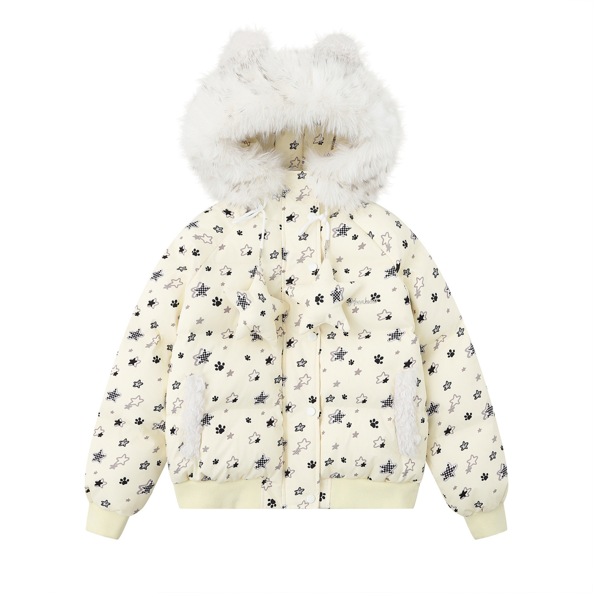 可爱猫耳毛领复古星星连帽棉服女冬季宽松休闲保暖棉衣外套