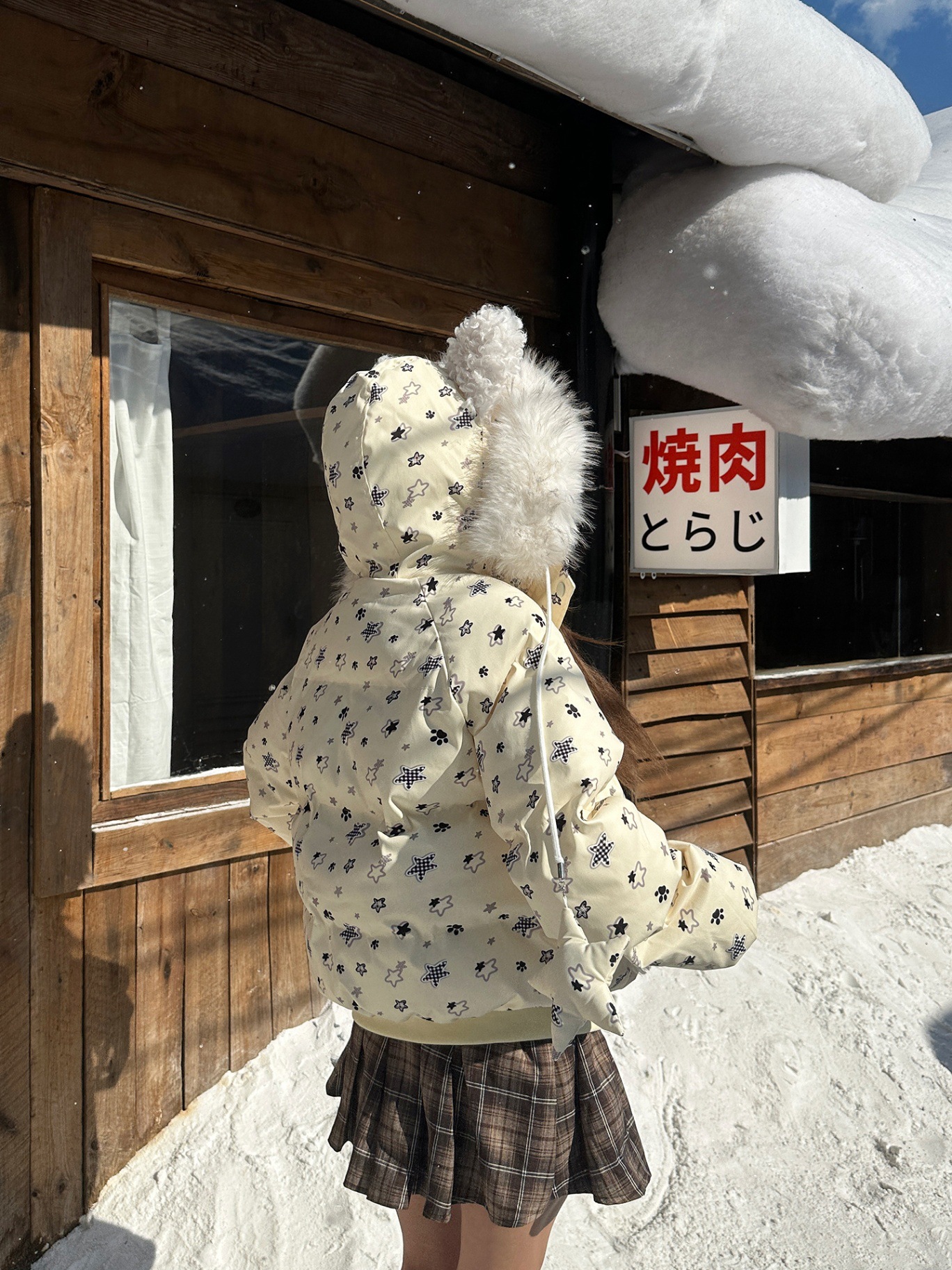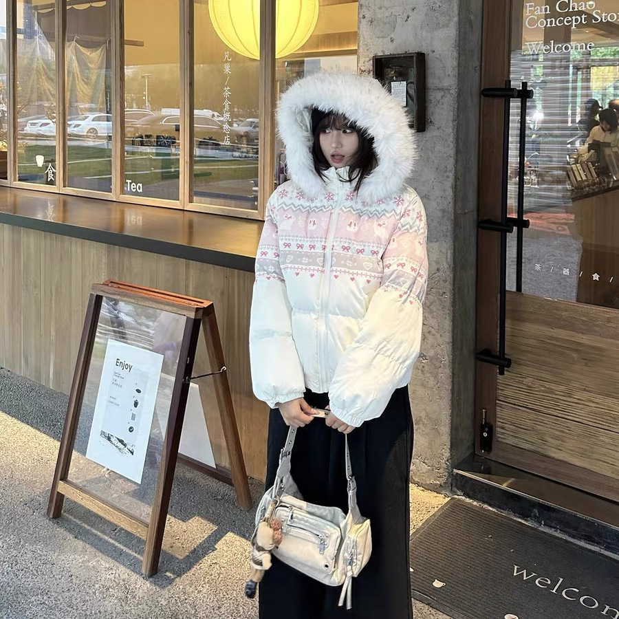 美式复古雪花兔子印花毛领连帽棉服女冬季新款百搭保暖面包服外套