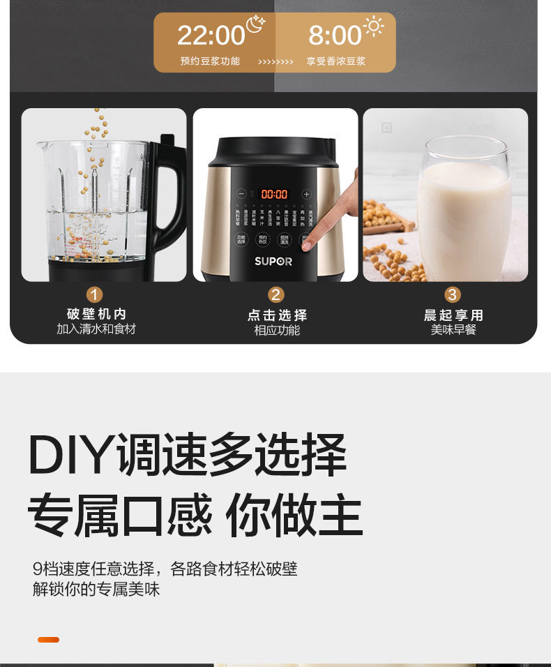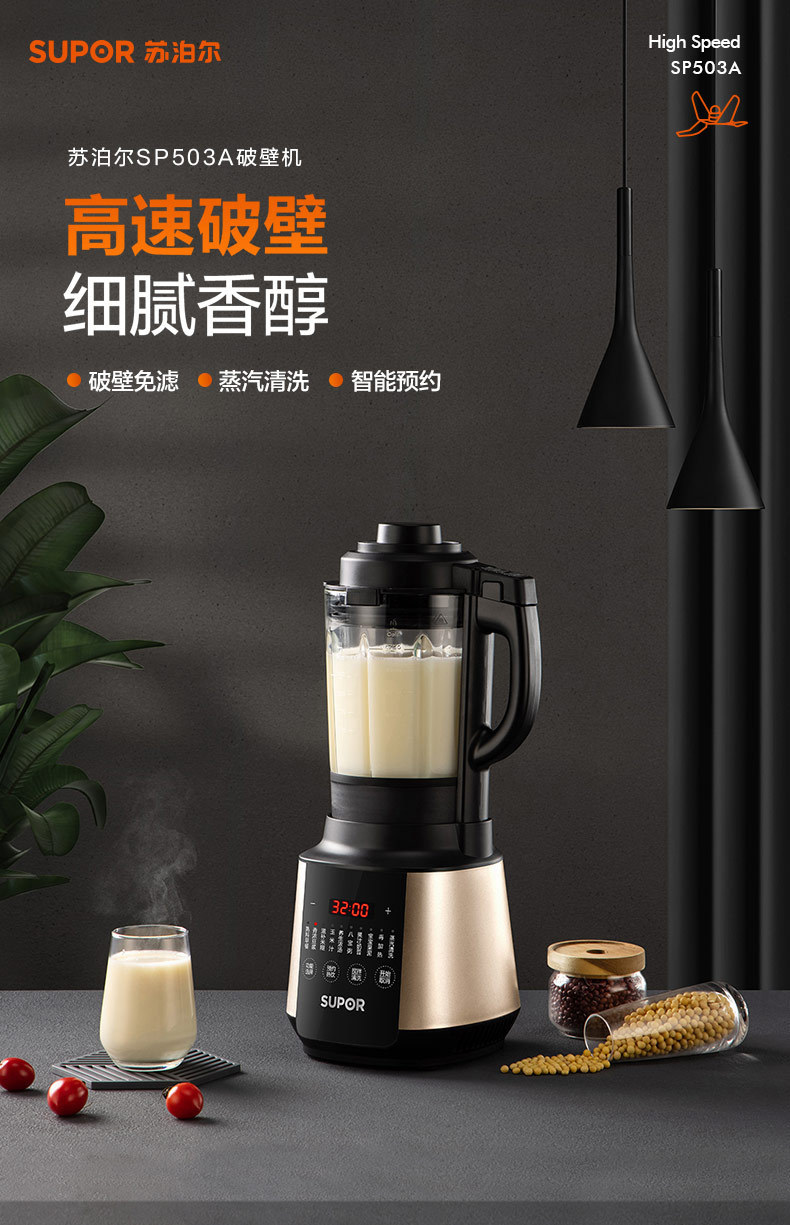 苏泊尔破壁机可拆洗低音全自动多功能家用加热辅食料理破壁豆浆机