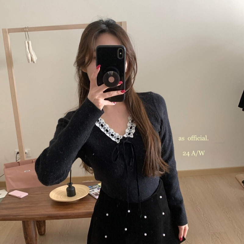 法式锁骨独特别致蕾丝拼接粉色毛衣女内搭秋冬领针织打底衫上衣
