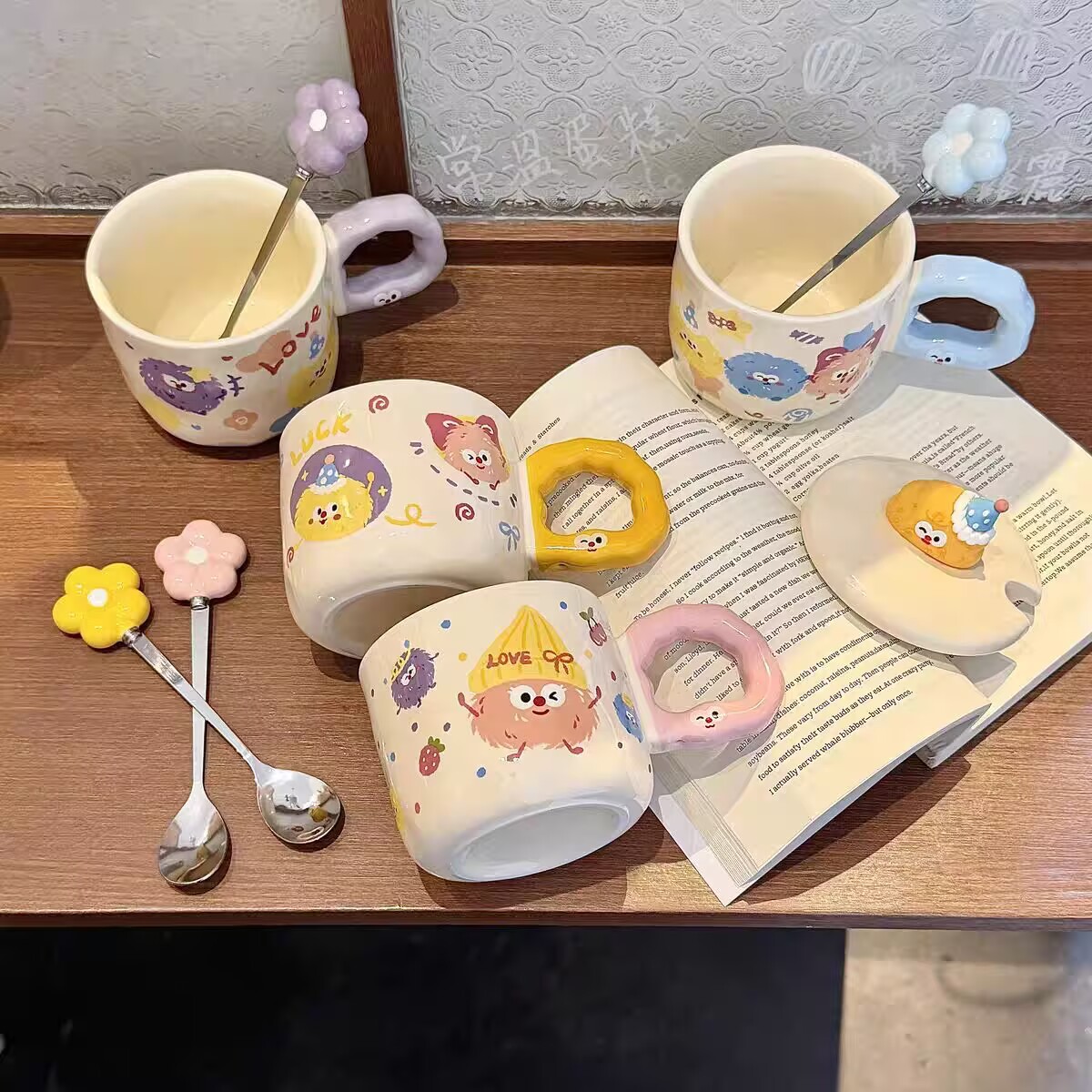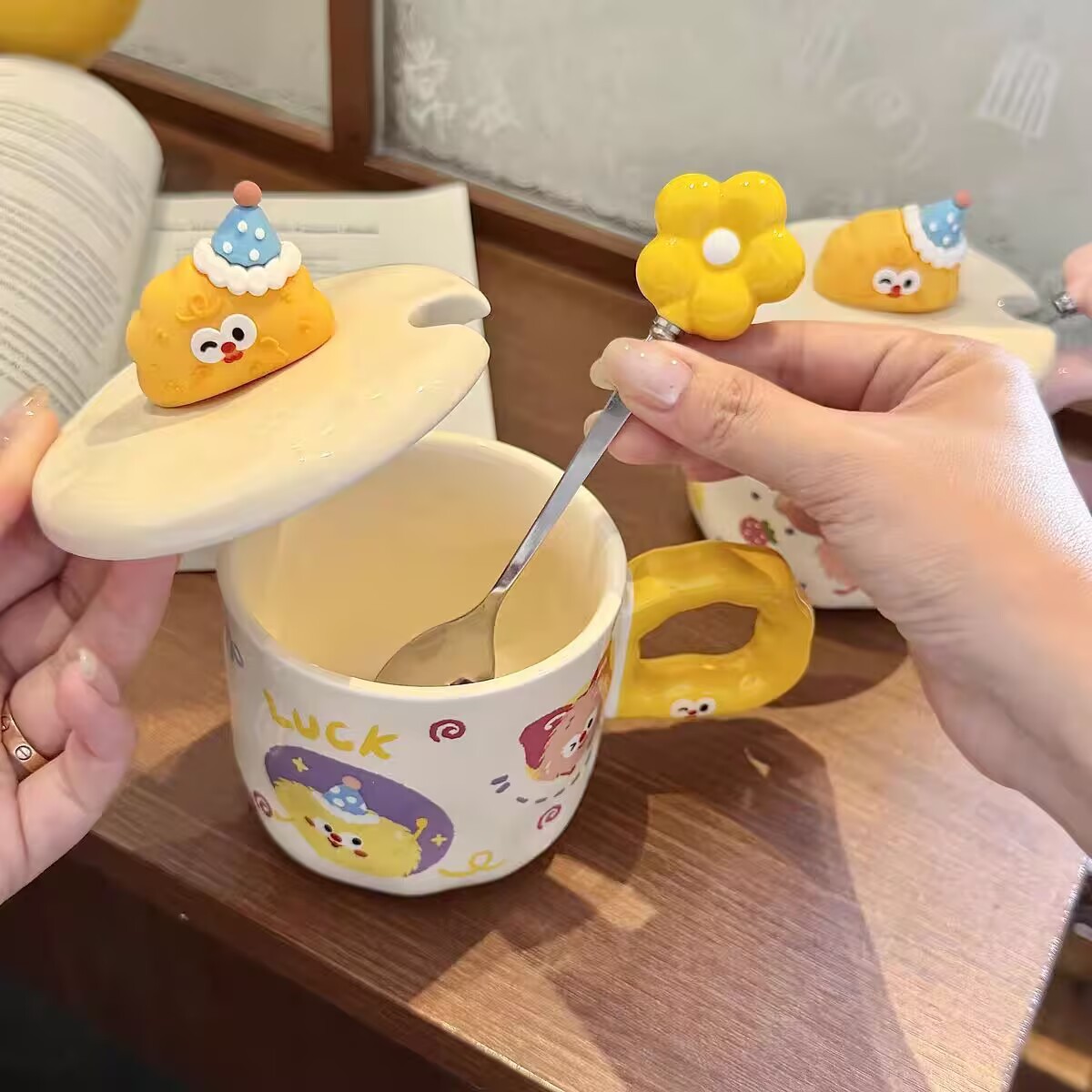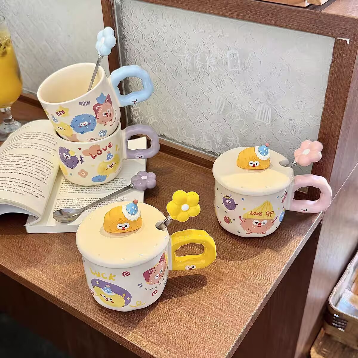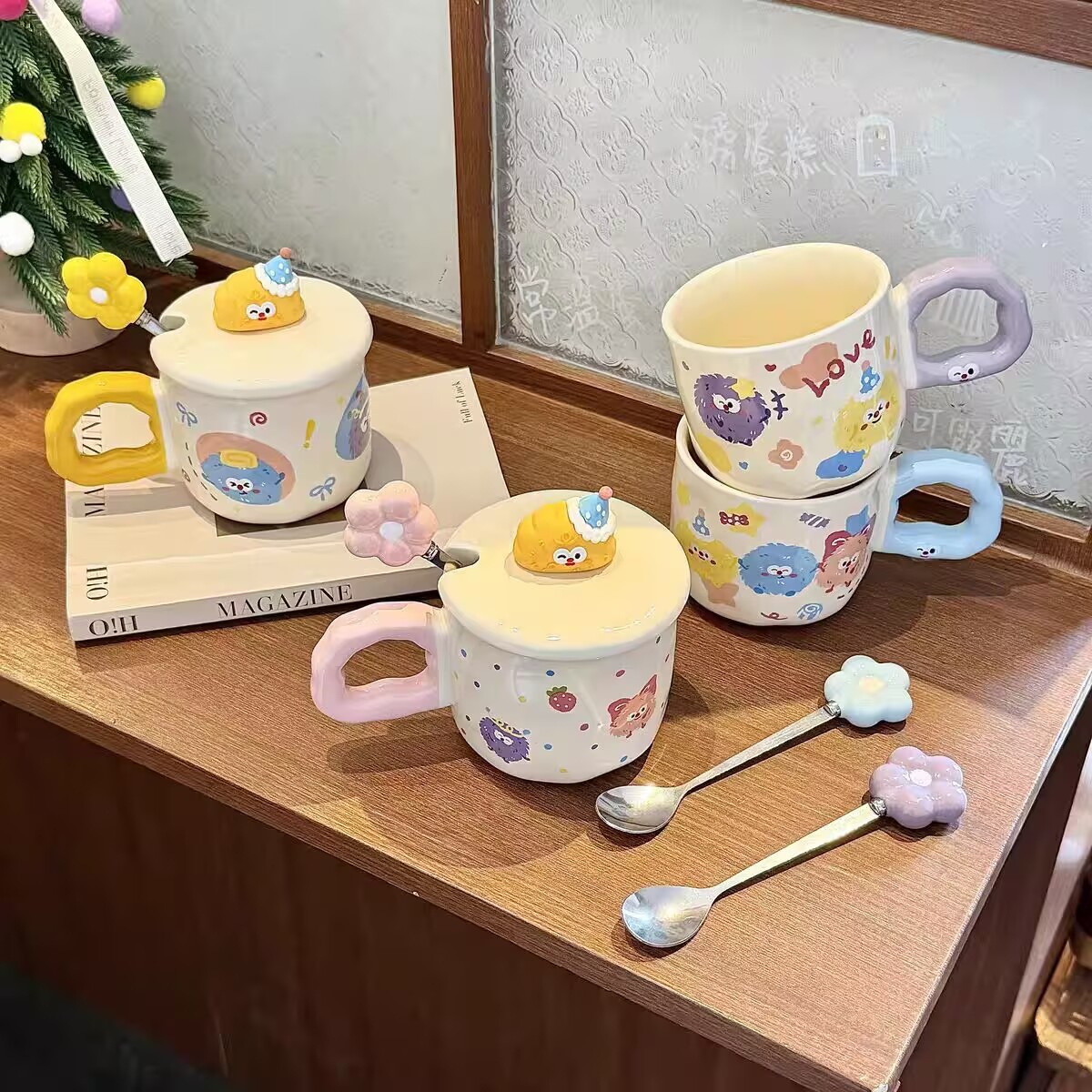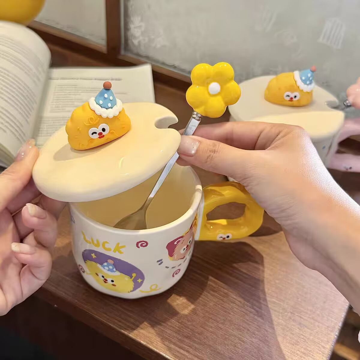 セラミックマグカップ蓋付きスプーン高颜値カップお土産女性家庭用カップかわいいカップルコーヒー朝食カップ