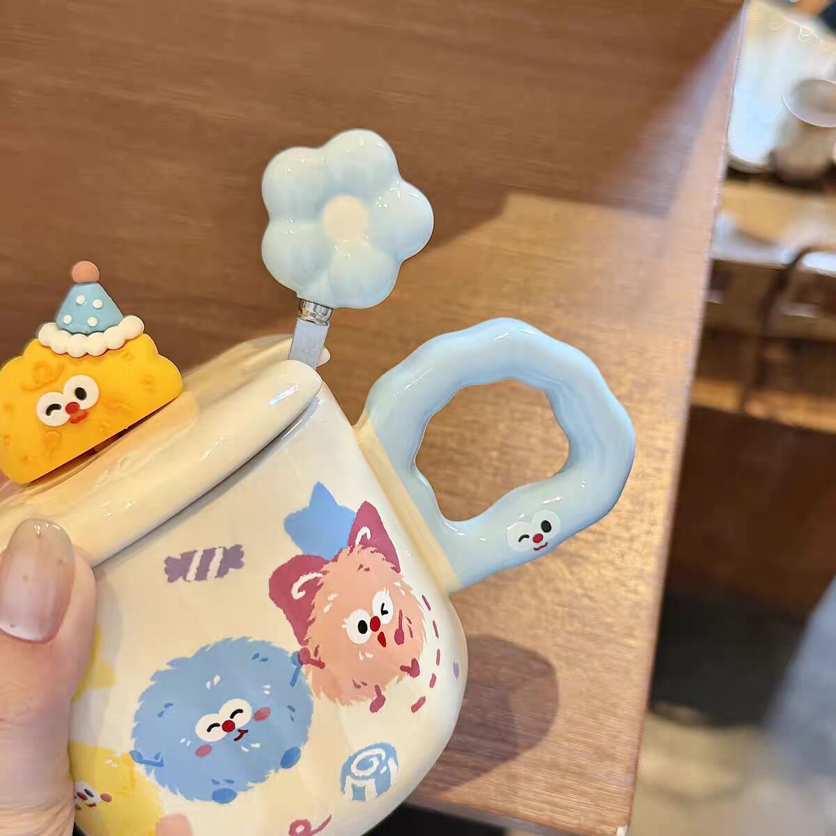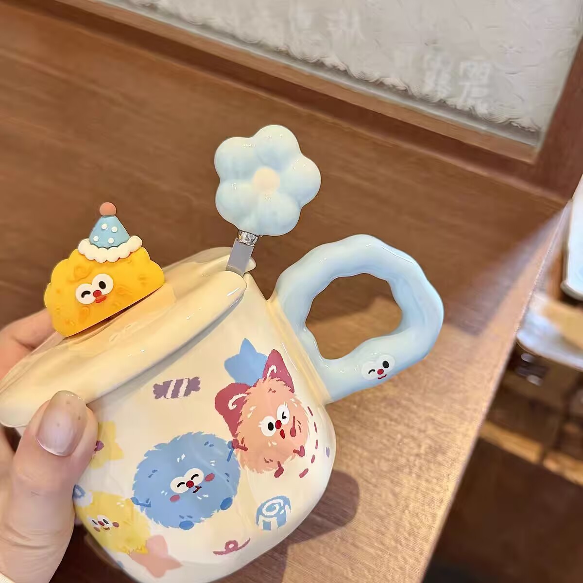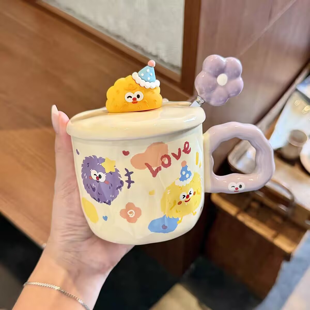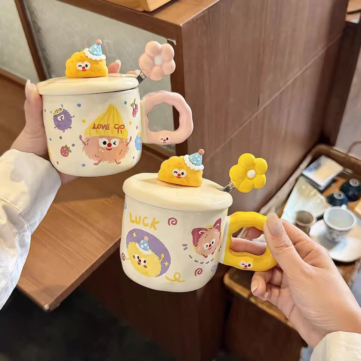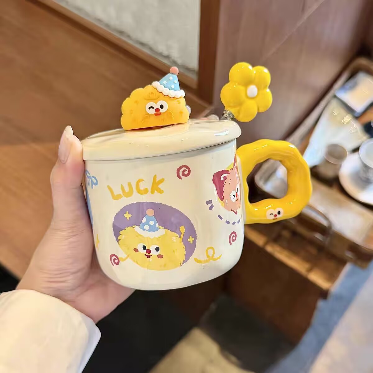セラミックマグカップ蓋付きスプーン高颜値カップお土産女性家庭用カップかわいいカップルコーヒー朝食カップ