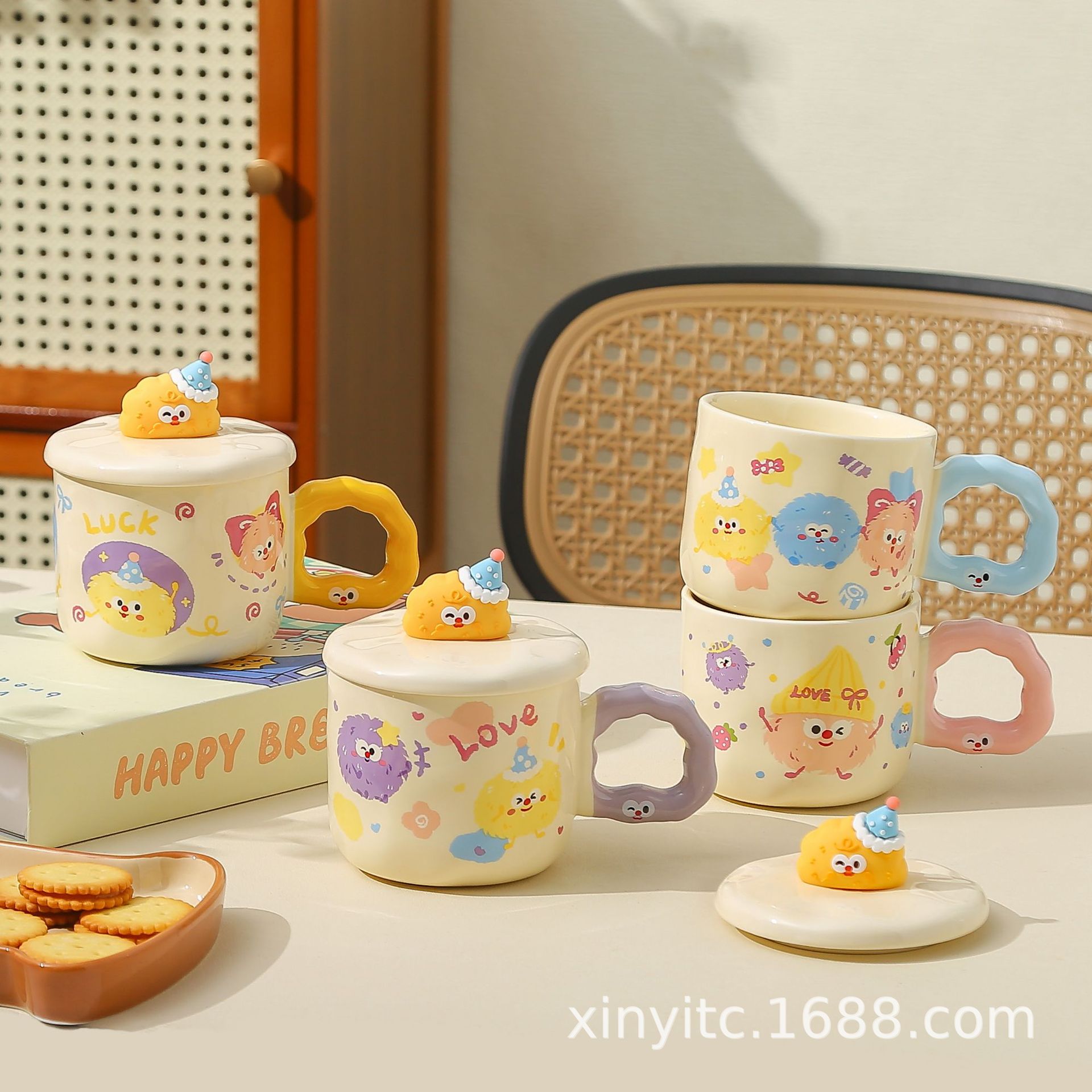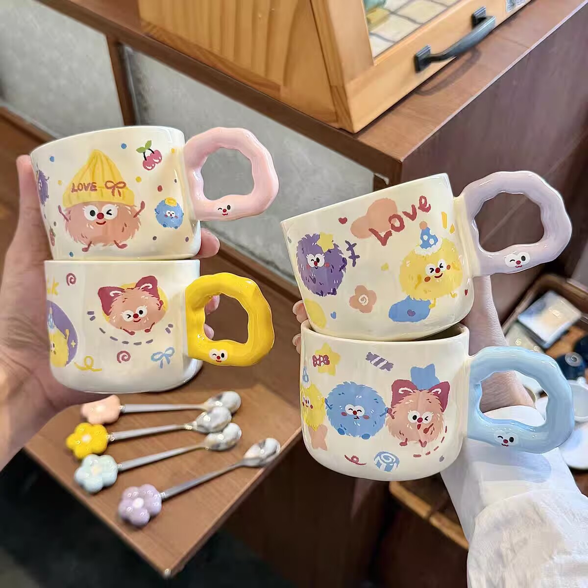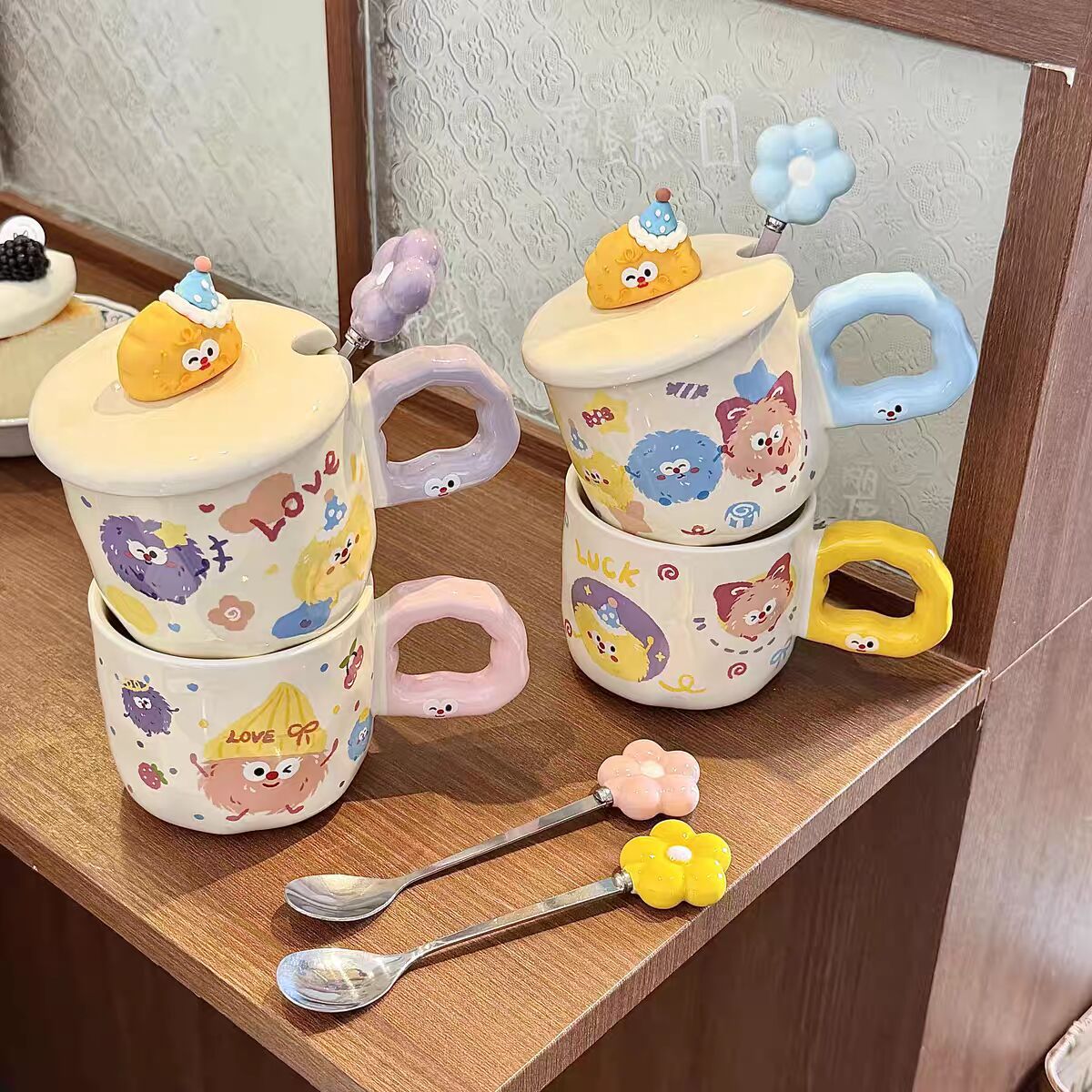 Ins風子犬マグカップ蓋付きスプーン高足カップ陶磁器コップ女子カップオフィスコーヒー朝食カップ
