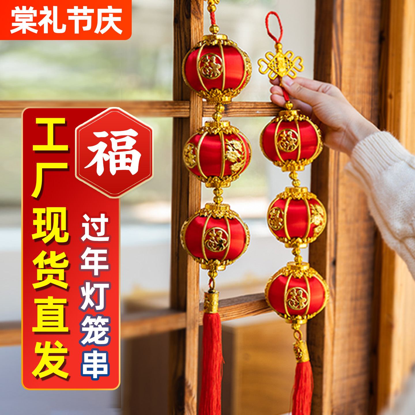 新年丝光红球串8cm小灯笼挂饰福字商场春节过年喜庆灯笼连串挂件
