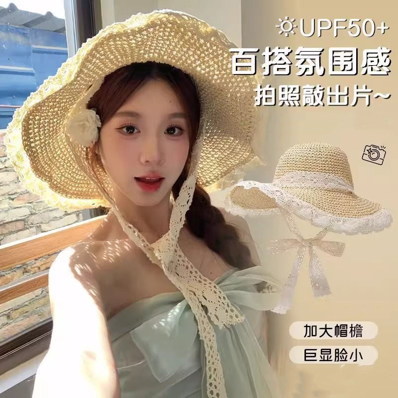 旅行用レディース韓国レース日焼け止めサンハット、海辺のビーチでの写真撮影、夏の麦わらサンハット