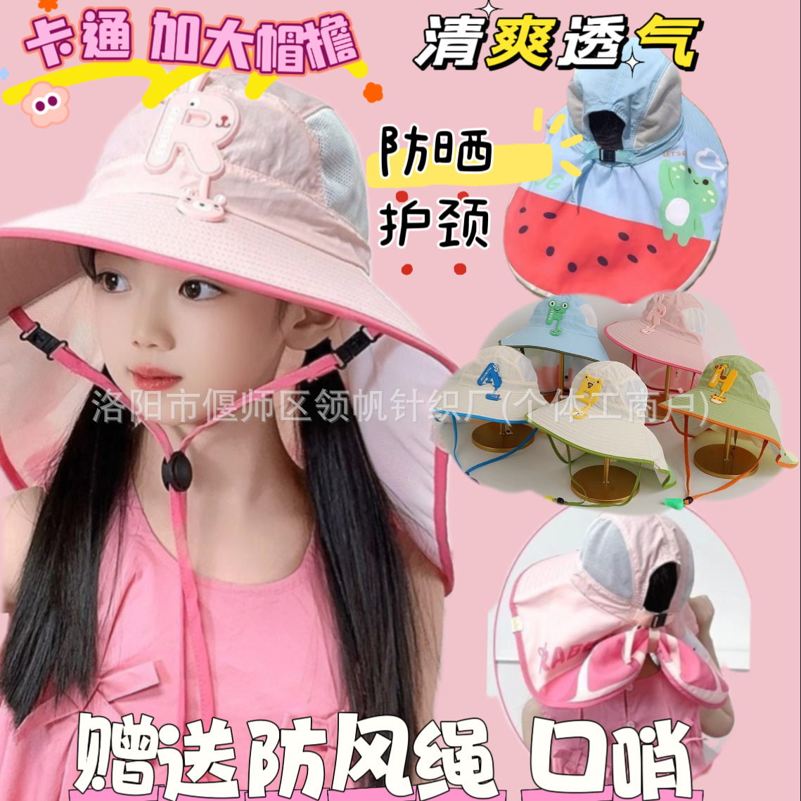 夏用子供用日よけ帽子、大きなつば、首の保護、サンリオ、男の子と女の子の赤ちゃん用、ショール付き、ホイッスル付き、日焼け止め、通気性