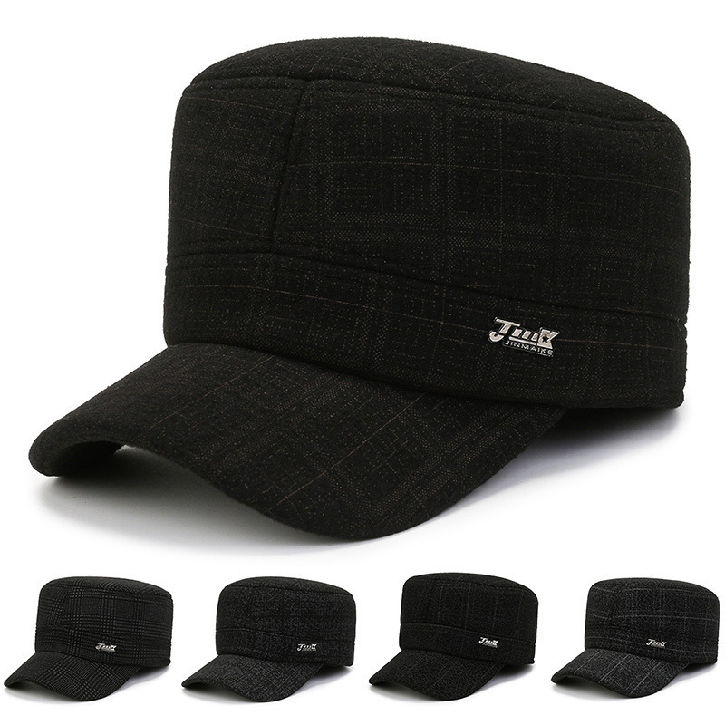 中高年男性用冬用ウール帽子、平型帽子、防風、裏起毛、厚手、保温、お父さん、おじいちゃん用耳当て付き綿帽子