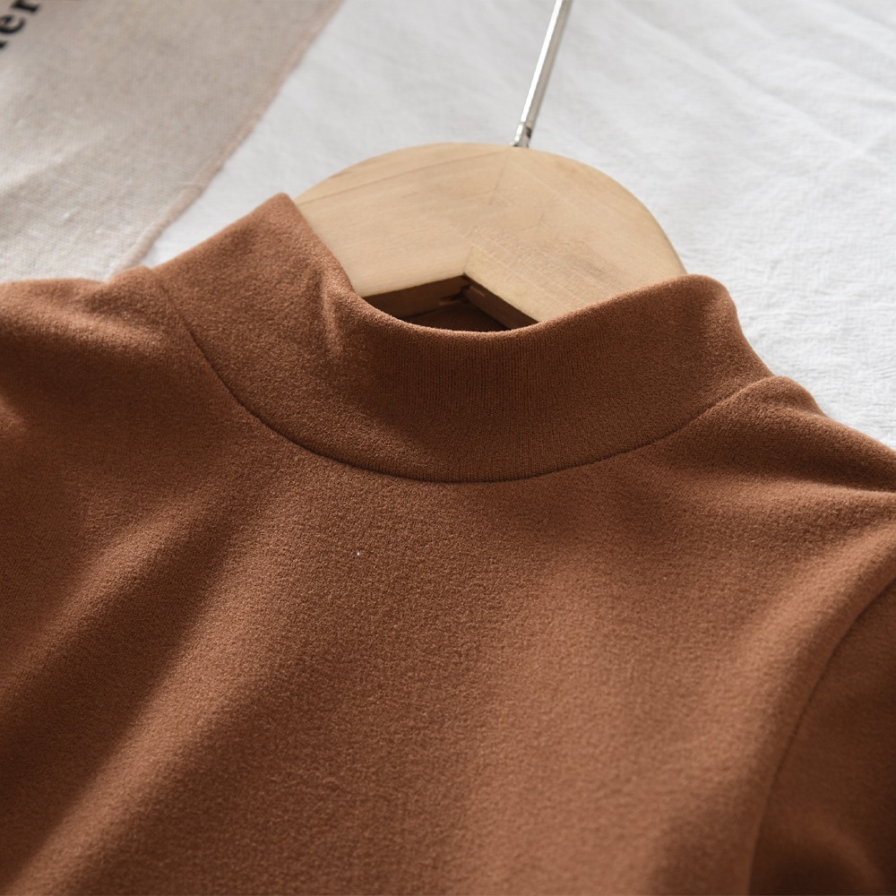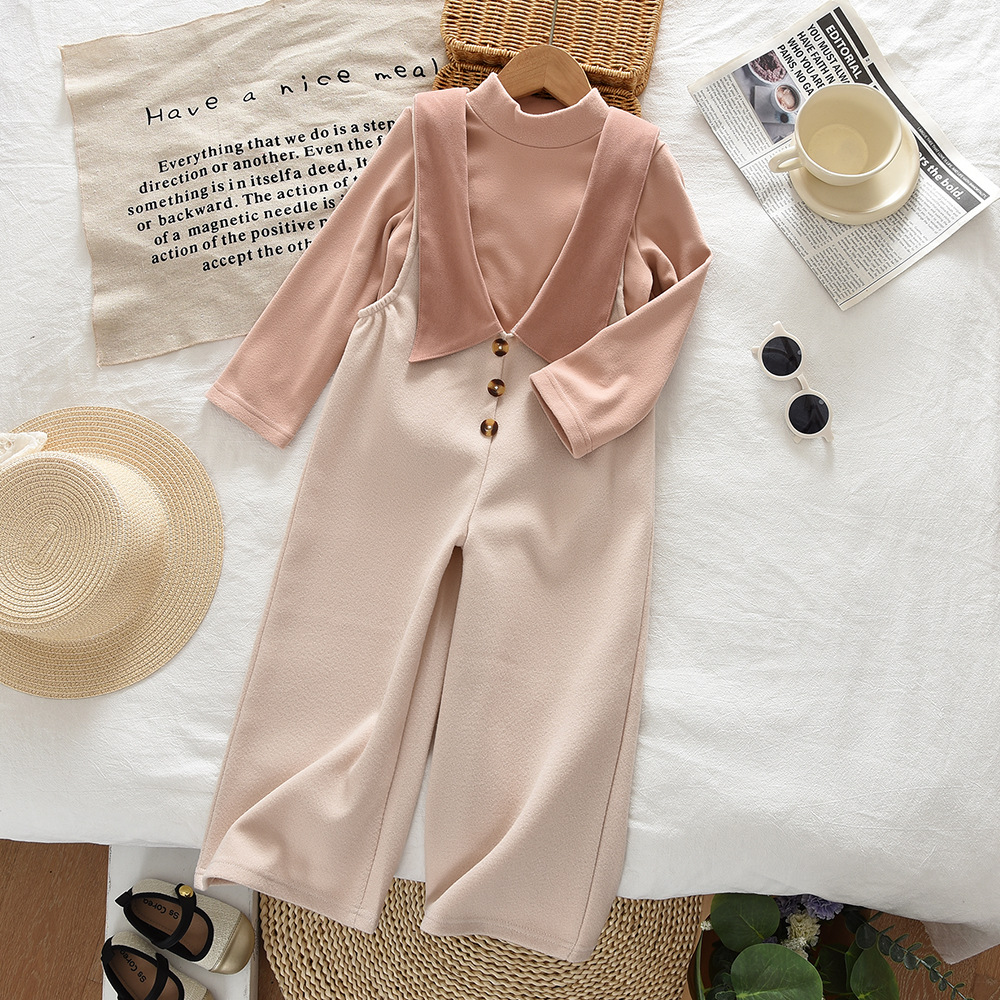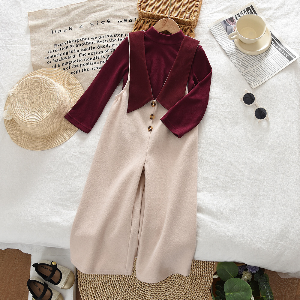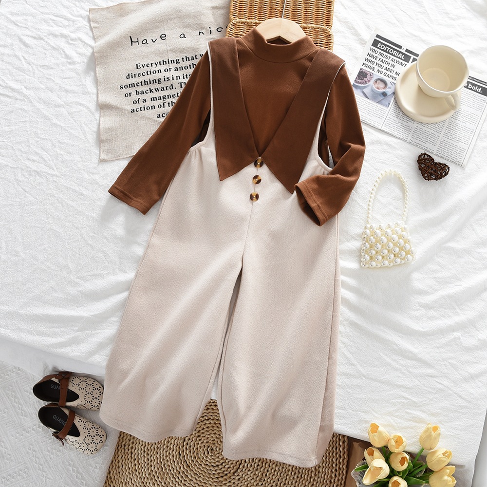 童装2025秋冬新款女童米色翻领背带裤女童高领加绒打底衫两件套