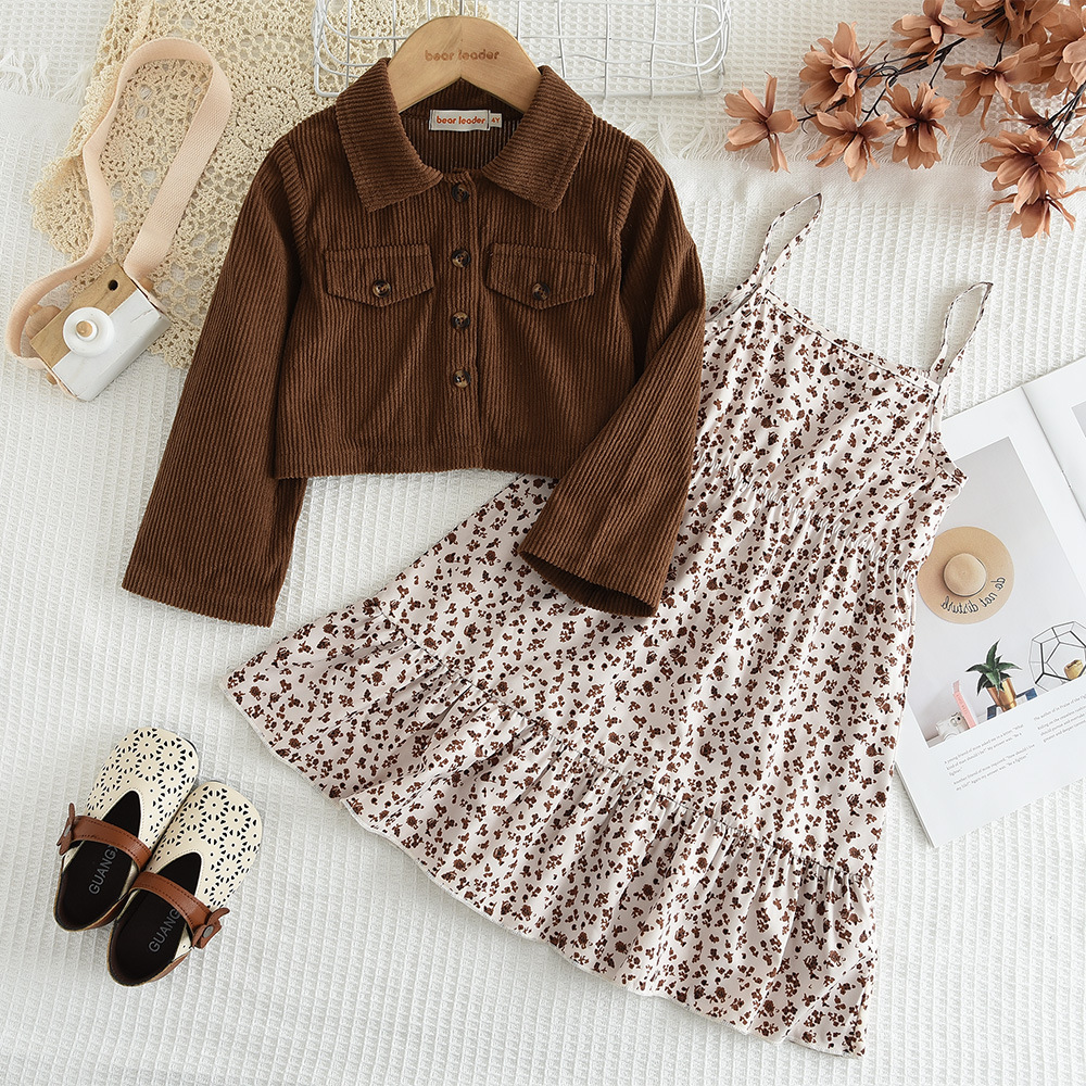 秋の気質ガールズスーツプリーツ花柄サスペンダースカート多用途ルーズコーデュロイ長袖トップジャケット2枚