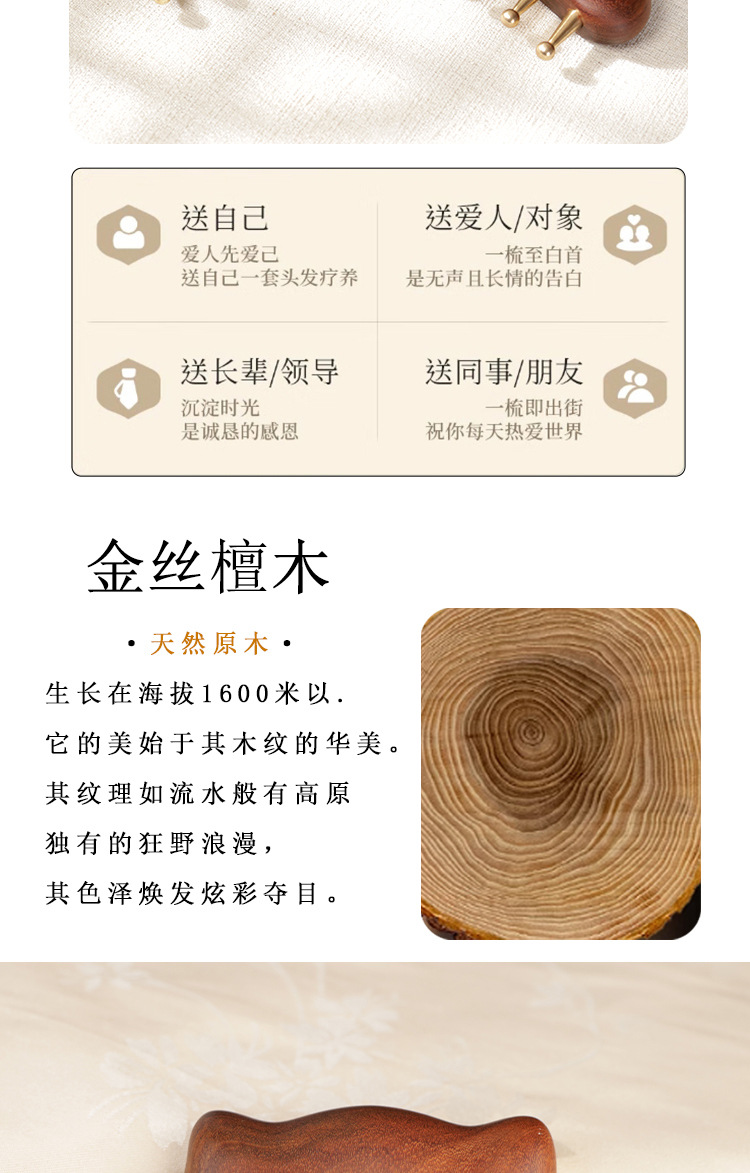 金丝檀铜齿猫耳按摩梳子实木无漆家用女士顺发梳头部头皮经络刮痧