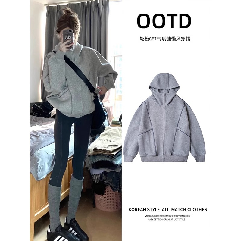 春グレーフード付きスウェットシャツジャケット女性のための秋 2025 新しい韓国スタイルルーズレイジースタイル初秋カーディガン