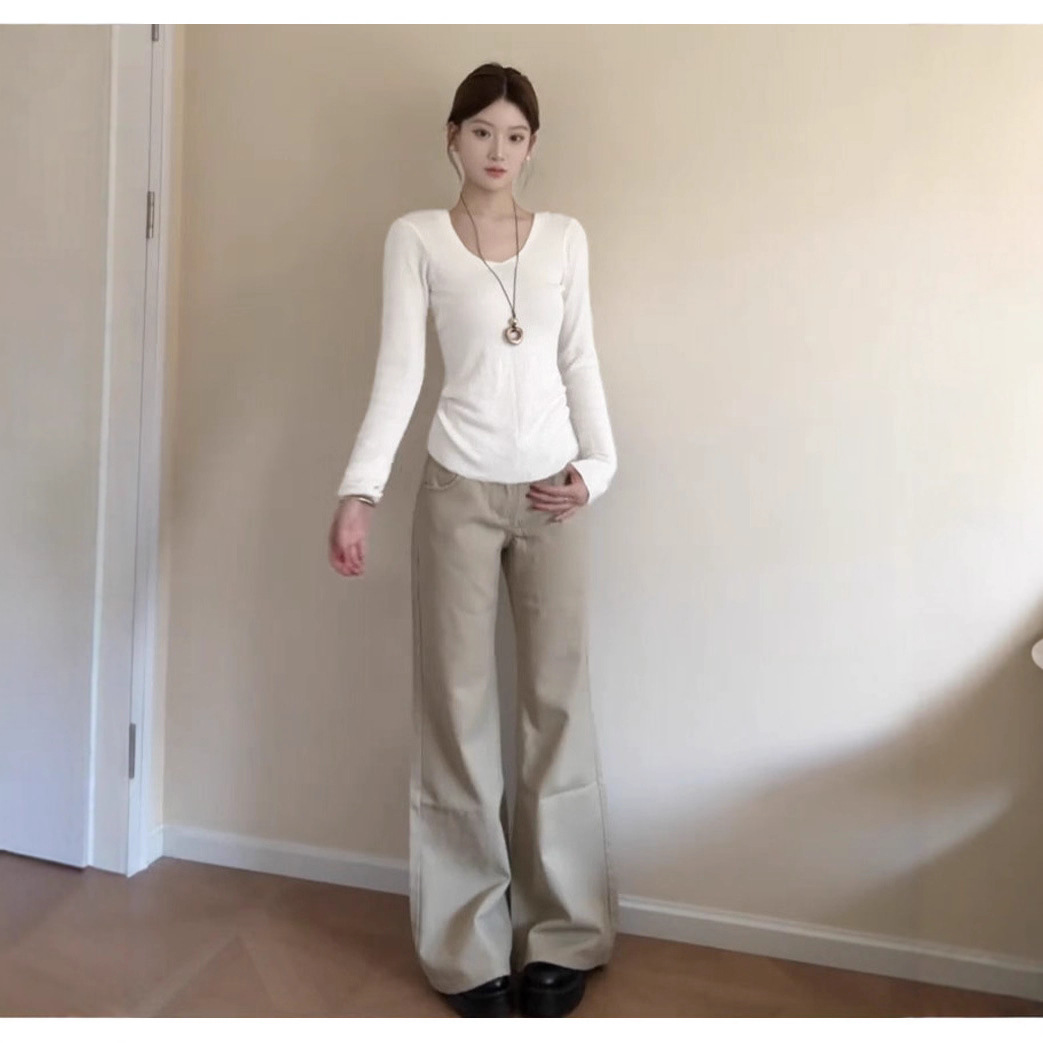 白インナーレイヤリングシャツ長袖スリム秋右肩トップレディースTシャツUネックローネックアウター初秋薄手
