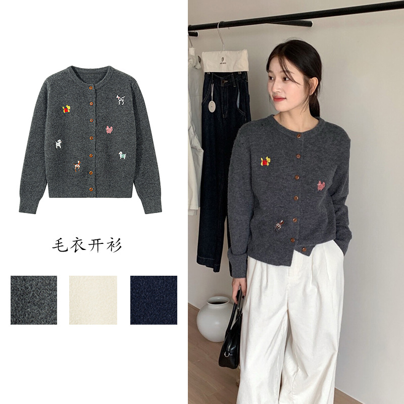 日系复古小狗刺绣针织衫外套女士秋冬外搭慵懒风软糯减龄毛衣开衫