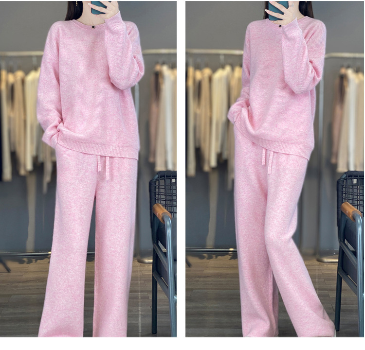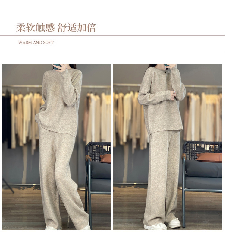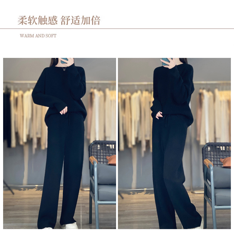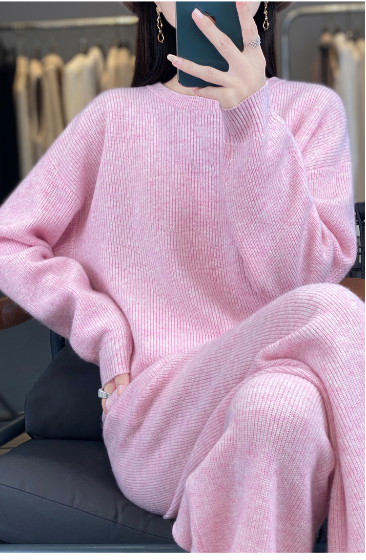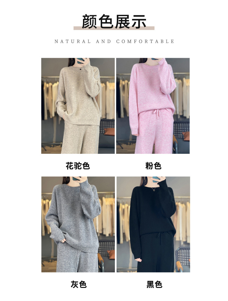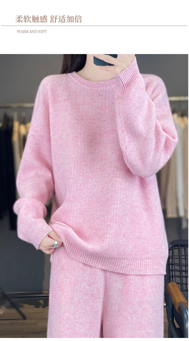 25秋冬新款羊绒针织套装女加厚圆领毛衣宽松阔腿裤时尚羊毛两件套