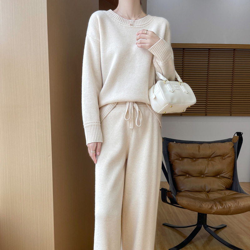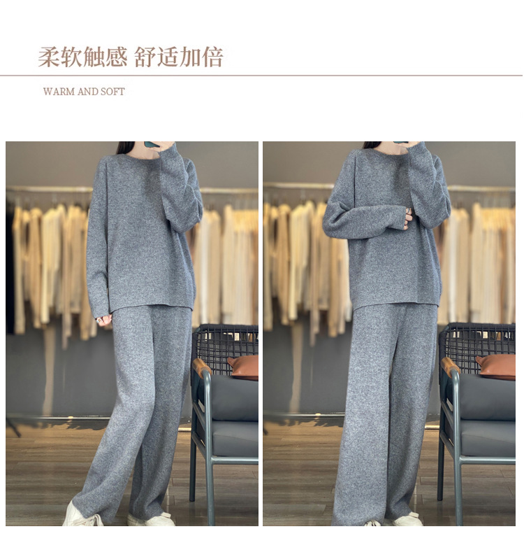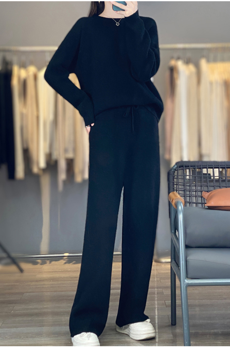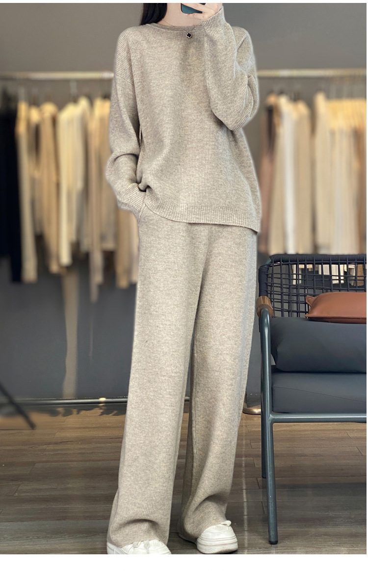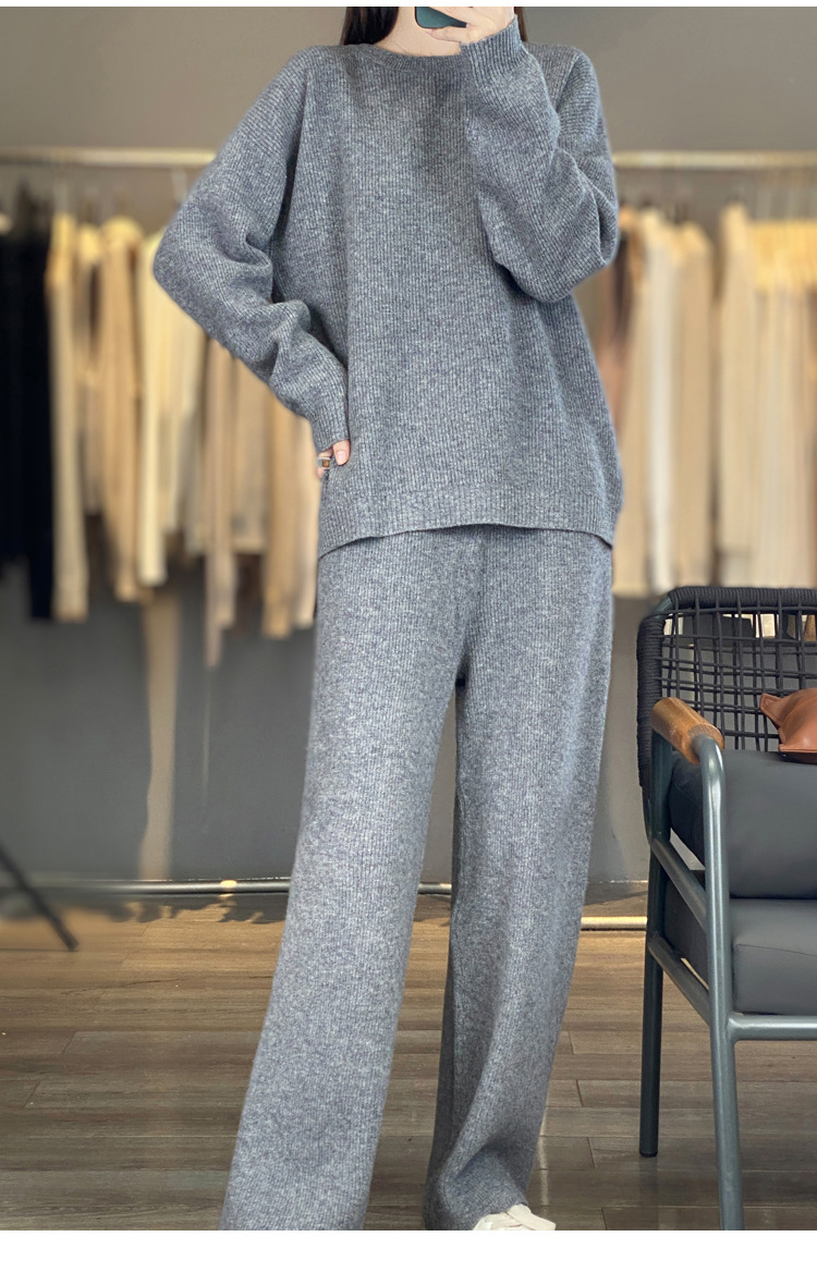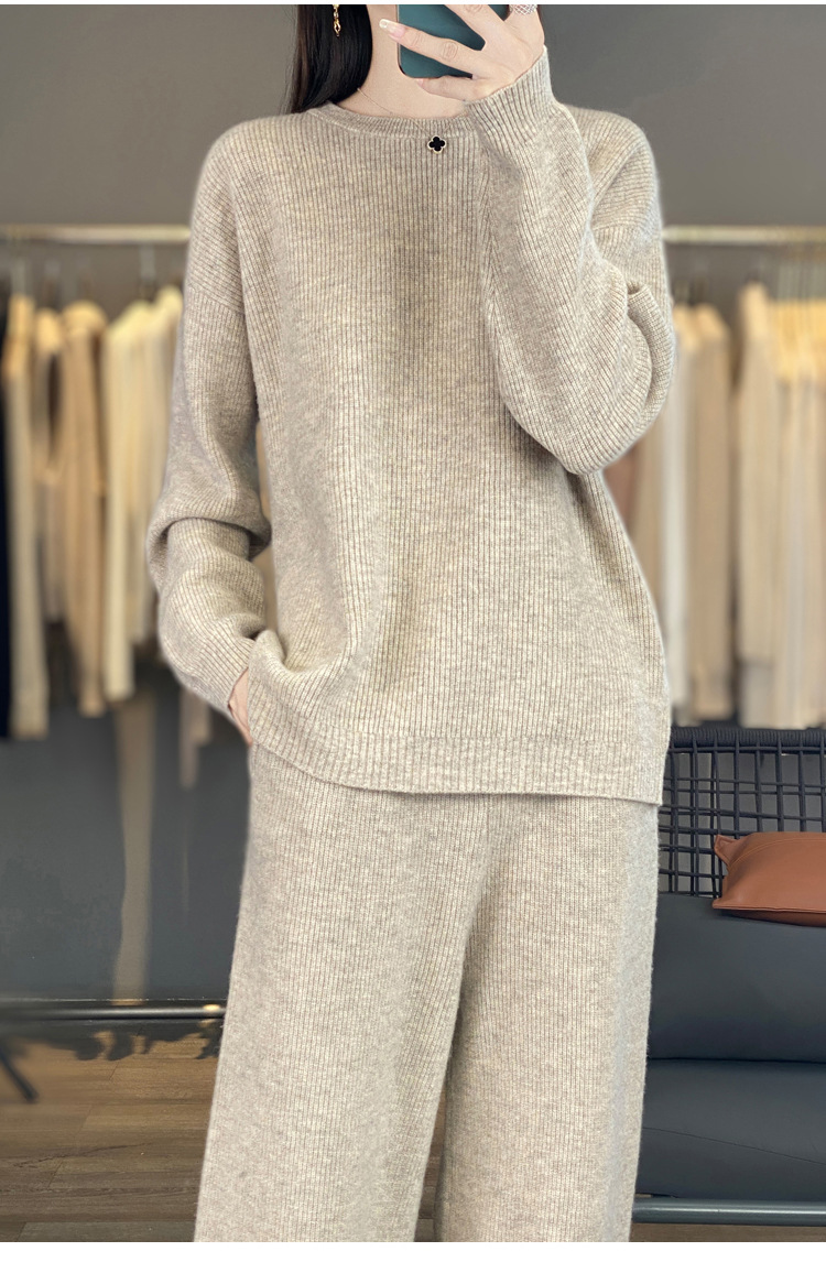 25秋冬新款羊绒针织套装女加厚圆领毛衣宽松阔腿裤时尚羊毛两件套