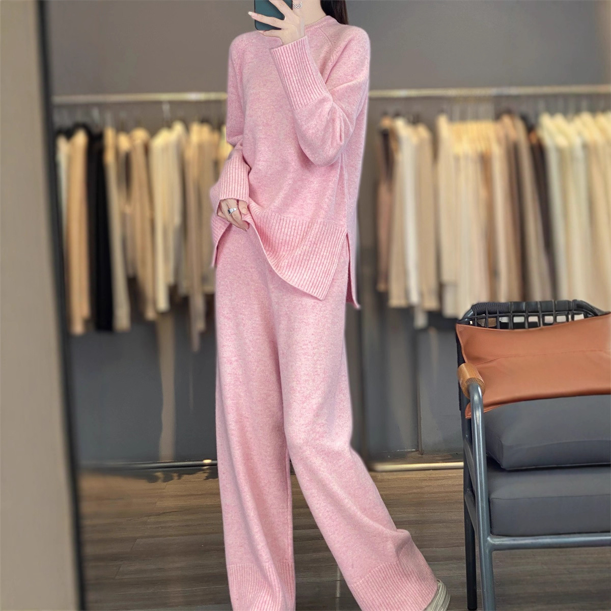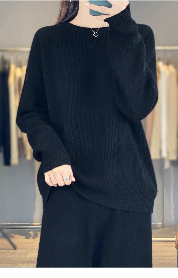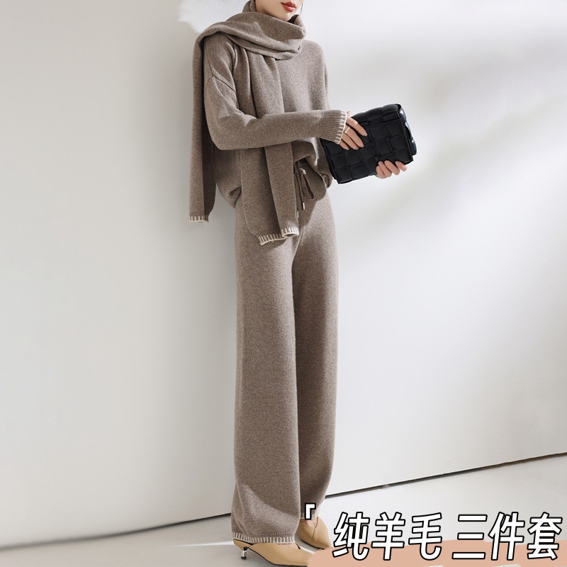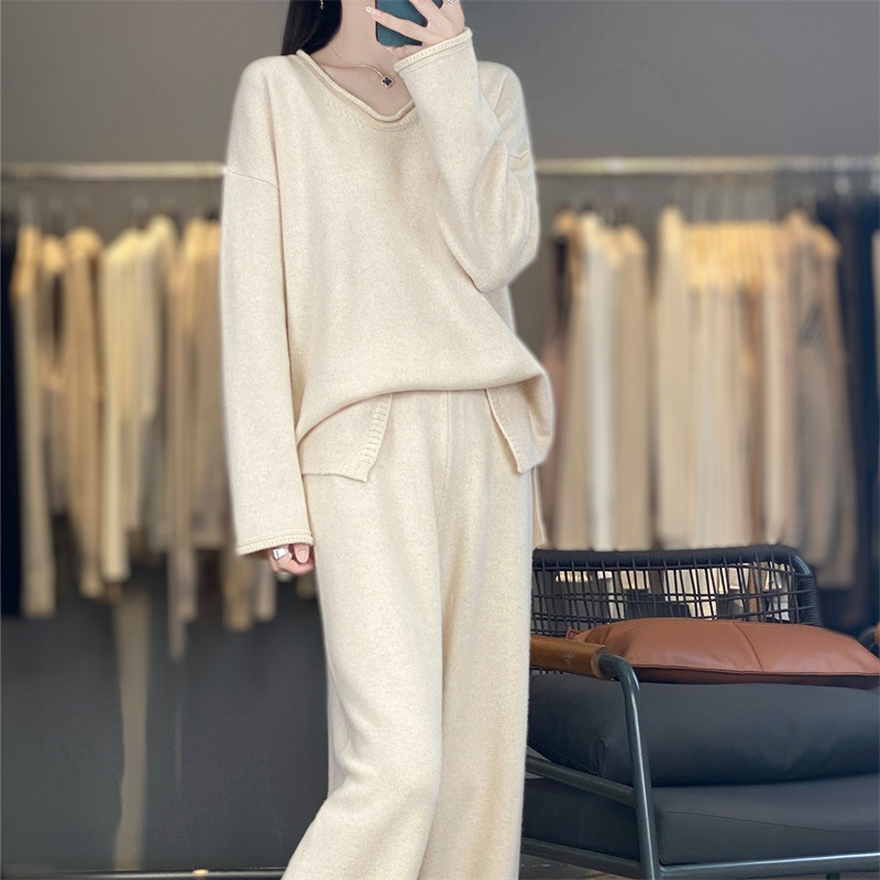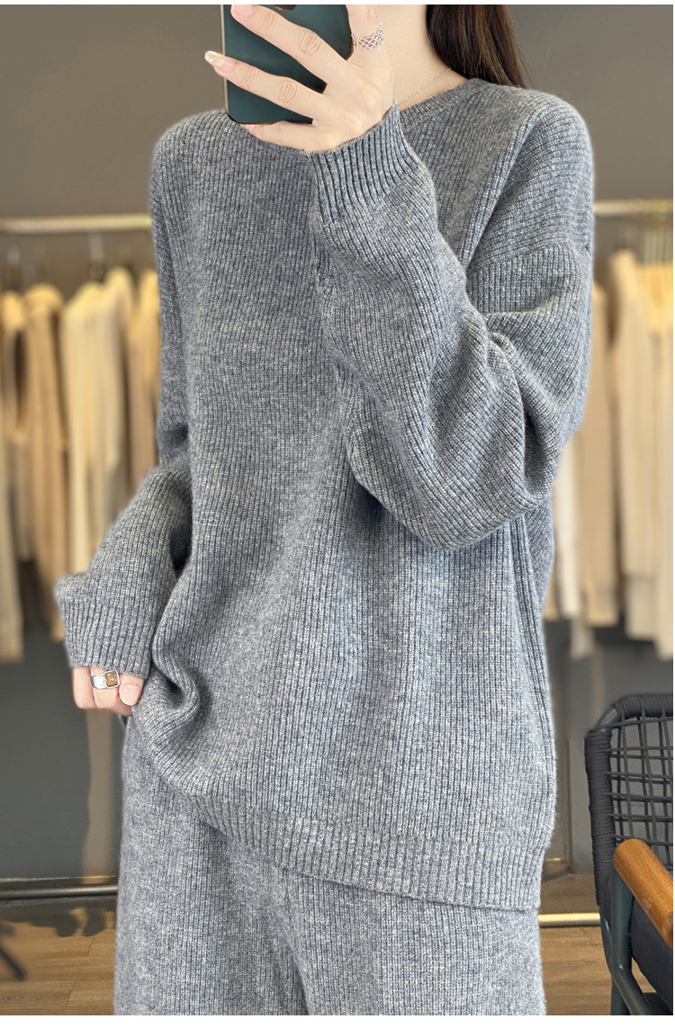 25秋冬新款羊绒针织套装女加厚圆领毛衣宽松阔腿裤时尚羊毛两件套