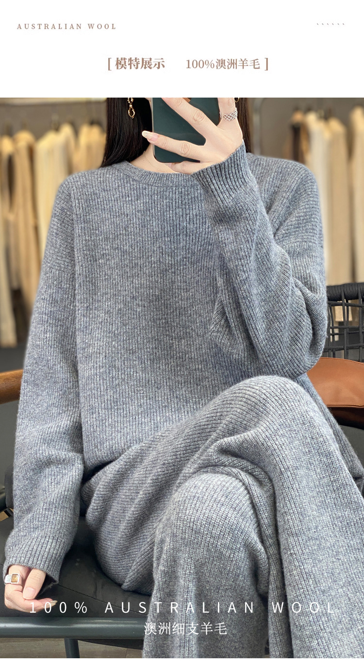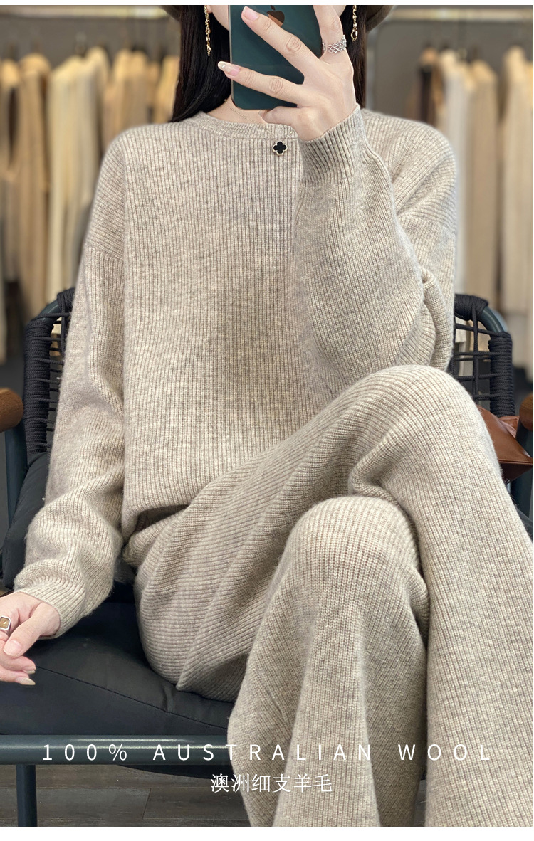 25秋冬新款100羊毛套装女加厚圆领毛衣宽松阔腿裤时尚羊绒两件套
