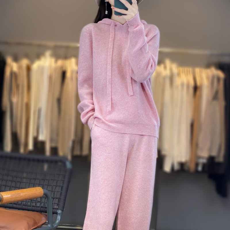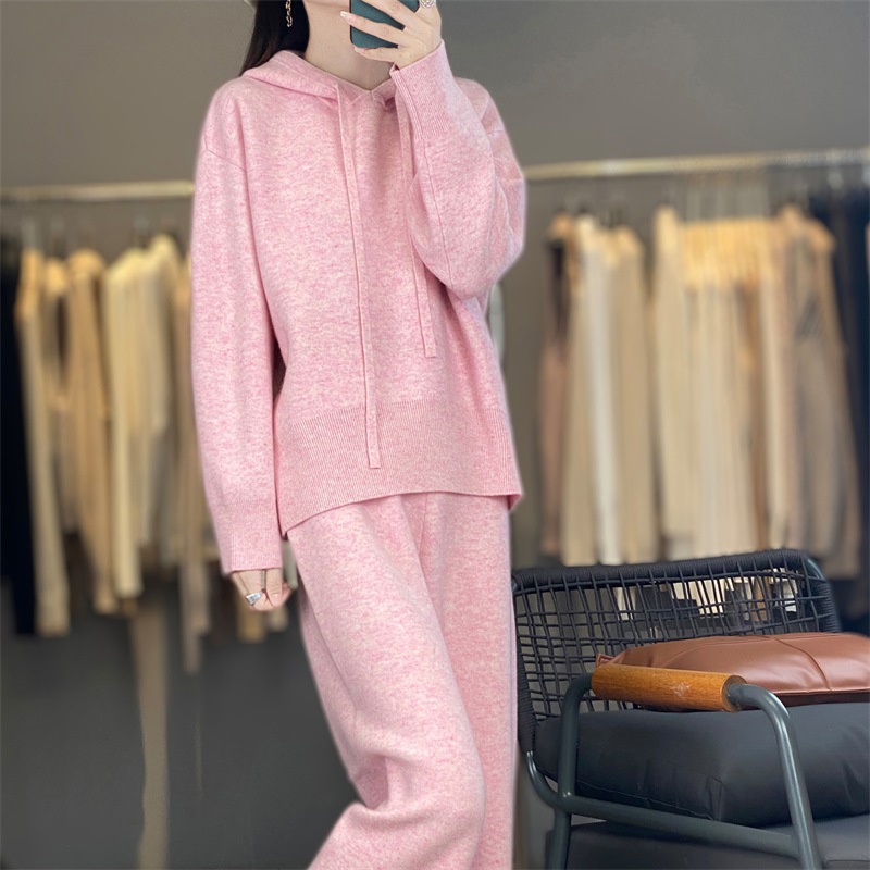 重磅澳洲羊毛套装纯色慵懒风宽松加厚毛衣针织帽衫阔腿裤套装女