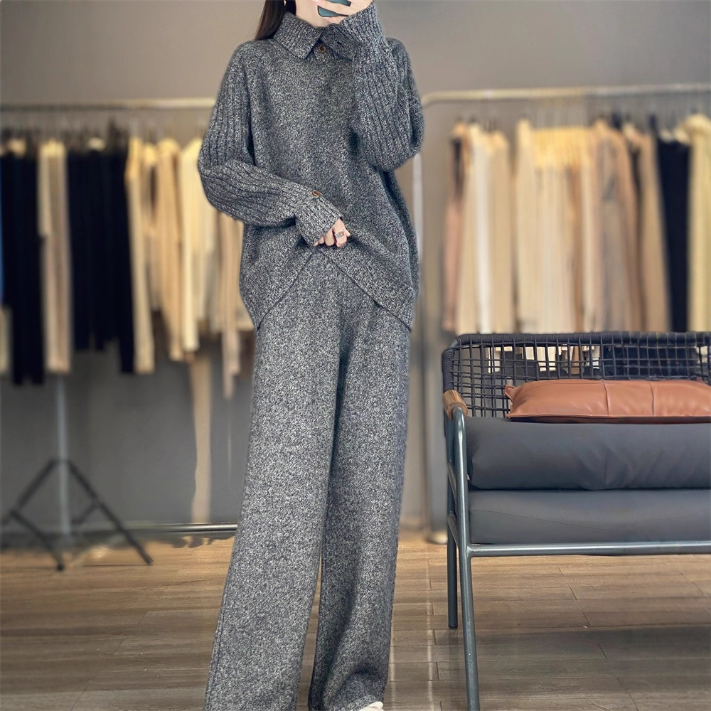 2025年秋冬新款纯羊毛花纱三股加厚翻领针织衫高腰阔腿长裤两件套