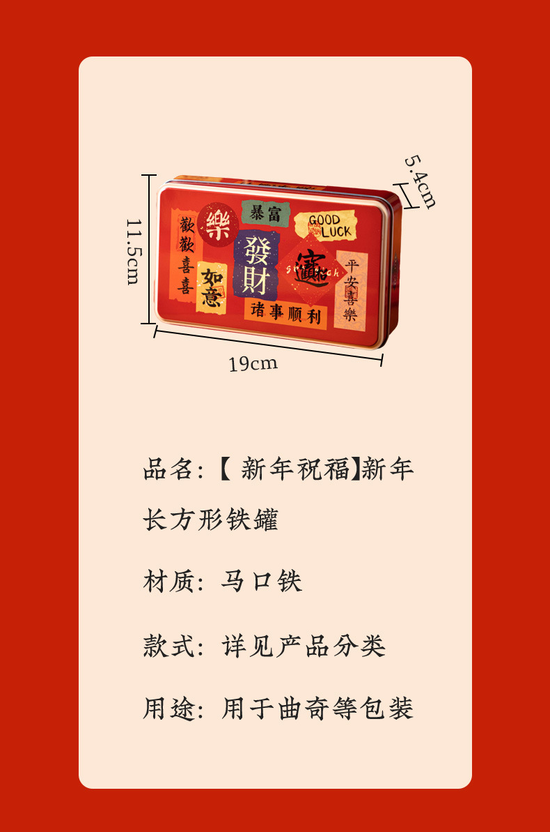 规格 【新年祝福】190x115x54 1只,【鱼跃福年】1只,【小熊烘焙屋】190*115*54,【淘气小熊】190x115x54,【可爱兔子】190x115x54,【原色款】160*100*65,【Good Time】160*100*65,【蜂蜜小熊】19*11.5*5.4cm 1只,【卡皮巴拉】19*11.5*5.4cm,【萌趣郊游】19*11.5*5.4cm 1只,【圣诞乐园】190x115x54 1只,红色开窗手提袋 21*8*19cm 5只,15*6.5cm长方形铁罐 【财源滚滚】1只,长方形铁罐 【太妃糖】15*6.5*6.5cm 1只,手提袋【發財】1只,开窗手提袋 21*8*19cm 5只