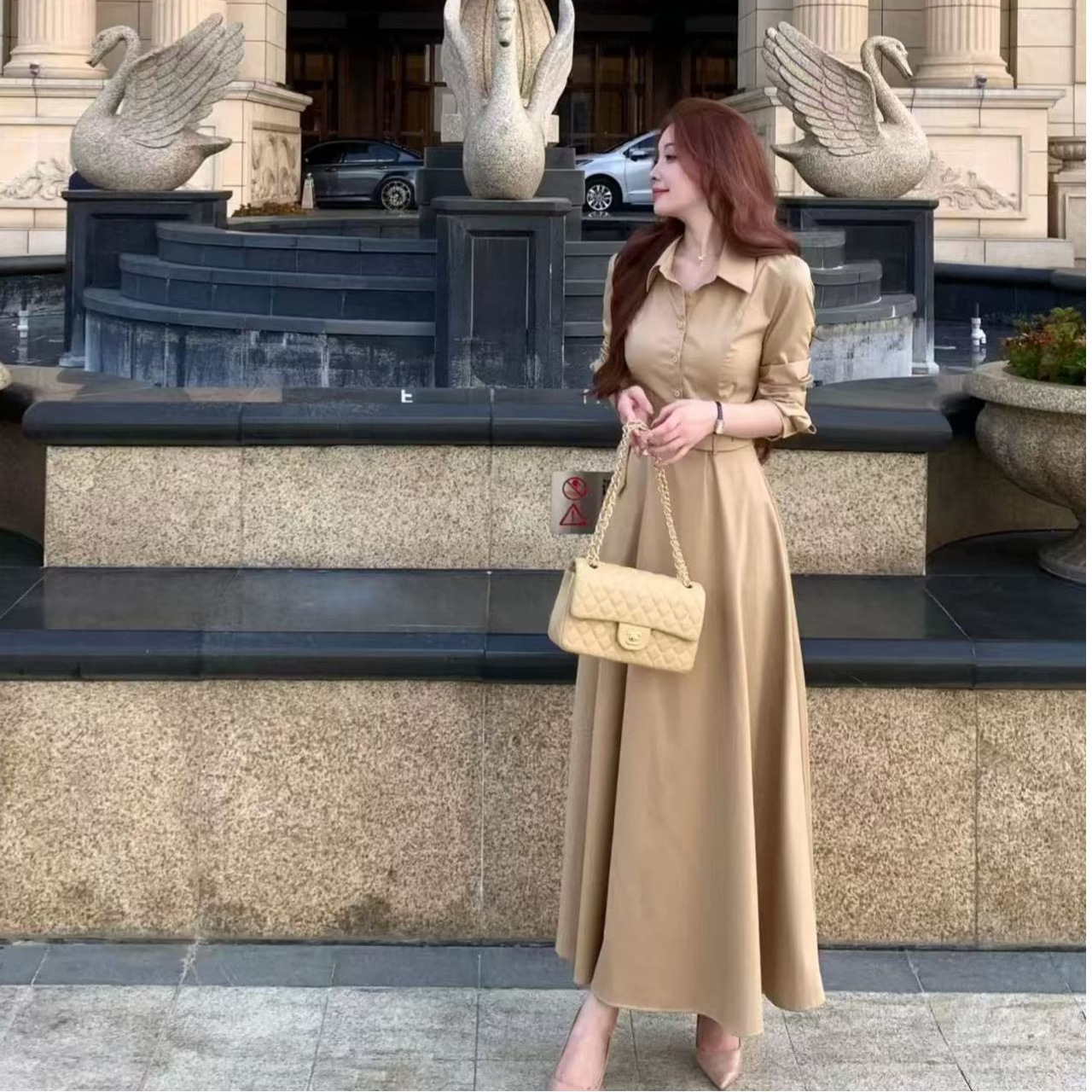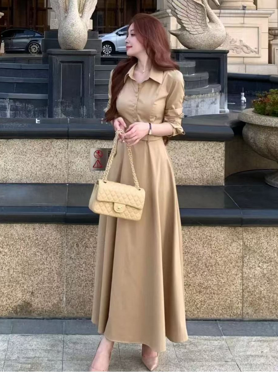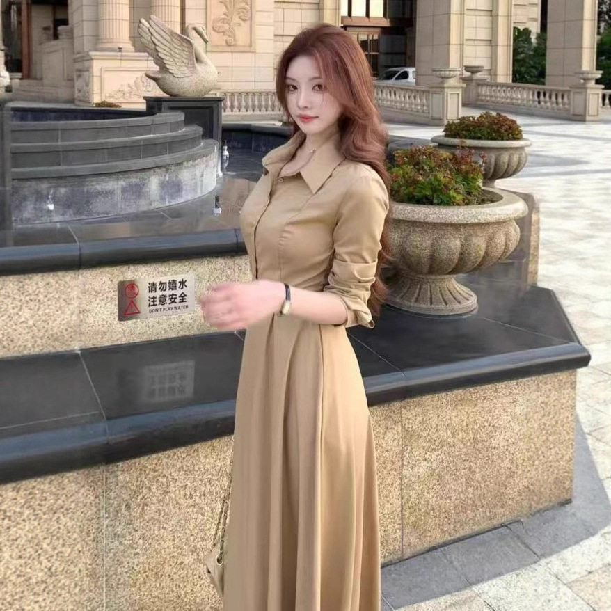 秋冬季新款韩系感翻领长袖气质连衣裙配腰带显瘦长款百搭长裙子女