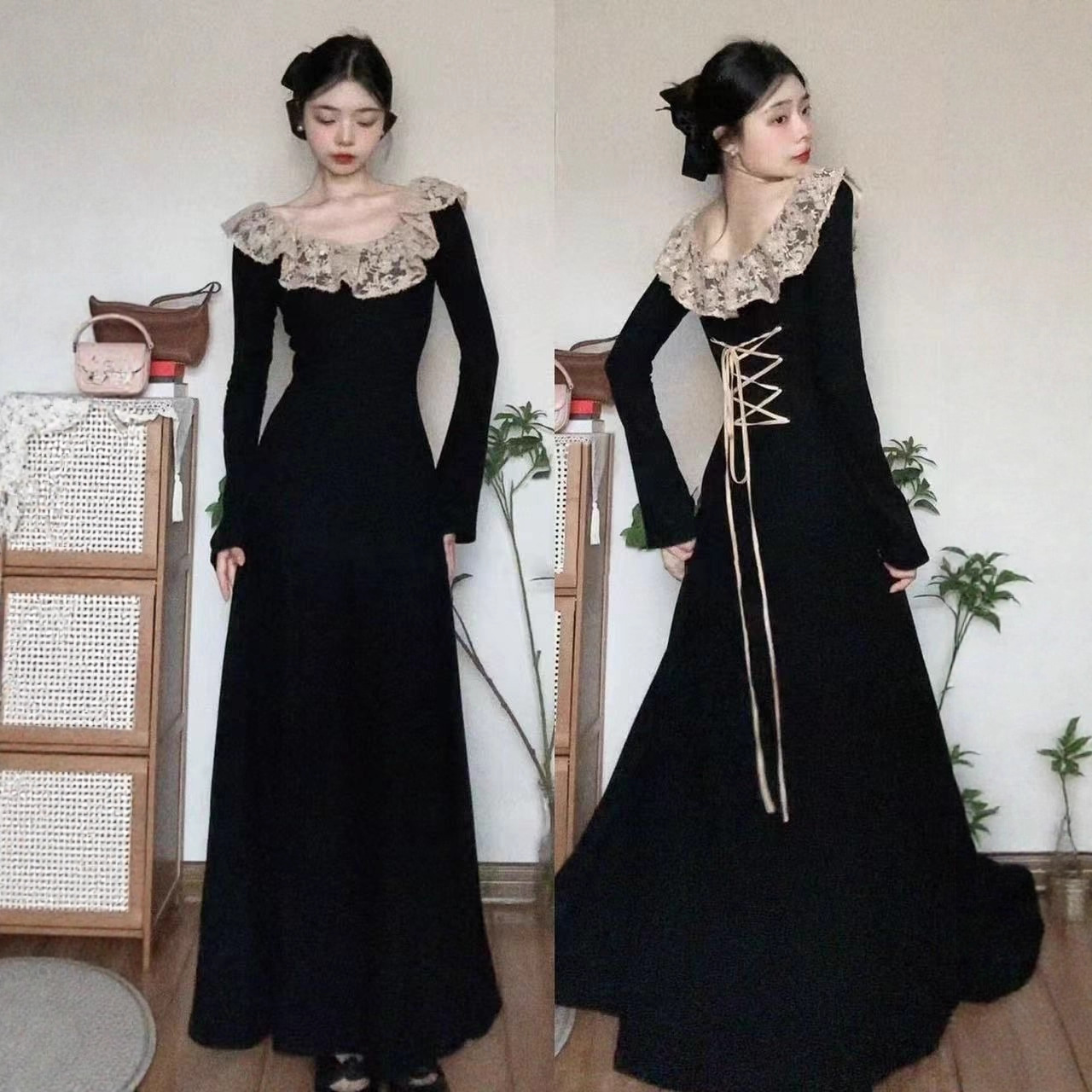 法式复古赫本风秋冬新款长袖针织显瘦蕾丝拼接气质长裙黑色连衣裙